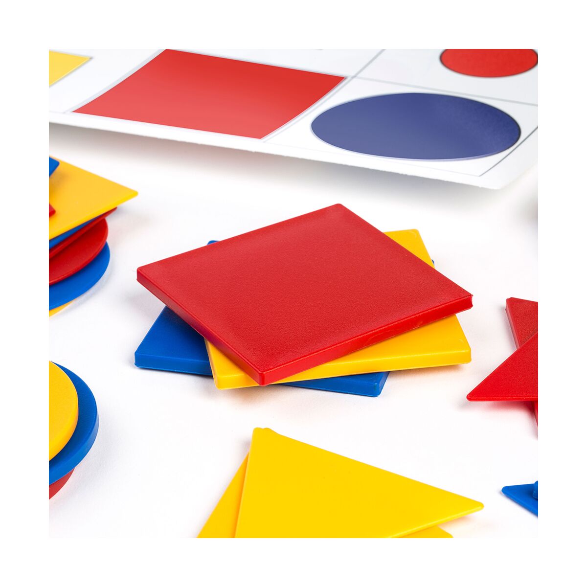 Produced in resistant plastic, this game features 5 basic geometric shapes: circle, square, triangle, rectangle and hexagon, each of which in 2 sizes, 2 thicknesses and 3 colors. They enable children to try out and discover shapes, sizes, colors and patterns, thereby familiarizing them with the world of geometry. This is the ideal resource for working on and handling different logical and mathematical concepts. The game comes with a pack of worksheets featuring 16 activities in an increasing order of difficulty, in addition to a teacher´s guide explaining how to use the blocks in different areas: