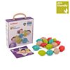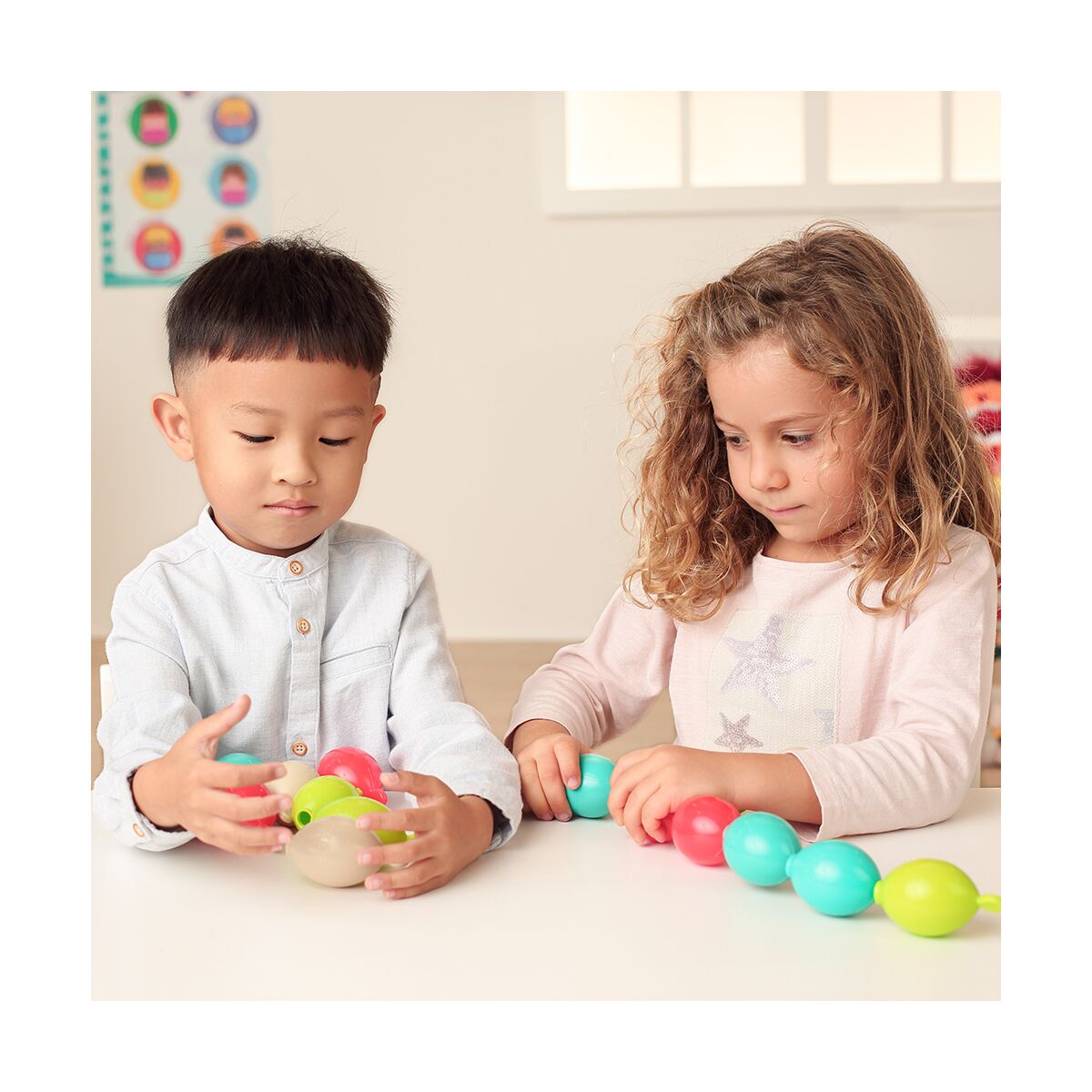 Big beads of assorted textures and colors, made of bioplastic derived from sugar cane, for children to string together. They have been designed for little hands and can be used by children with special needs thanks to their sizes, textures and colors. They snap together when gently pressed to form a chain, making playing time a really fun experience.
