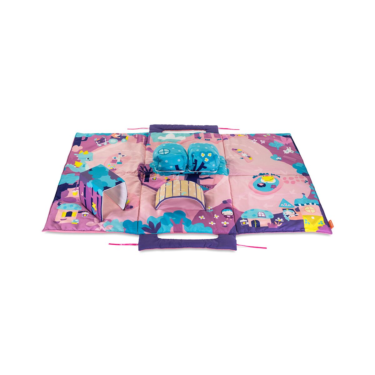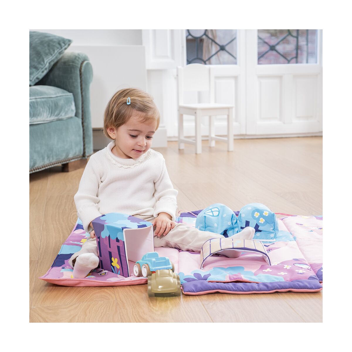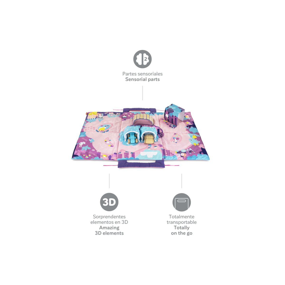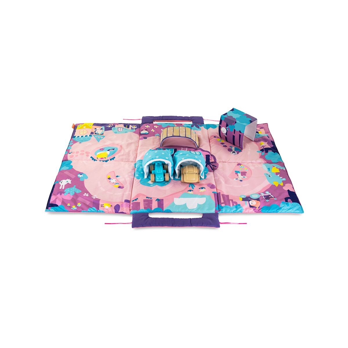 3D elements For an even better experience, our space mat includes 3D elements. Kids will really enjoy driving their toy cars over the exciting bridge, through the mysterious tunnel or parking them in the garage!Sensory elements The mat contains visual reflections that simulate water, crisp paper areas that are rocks in the road, and visual contrasts that develop kid’s sight.Easily transportable When folded, the cars are stored inside the mat, while a practical handle allows the parents to carry it around comfortably.Soft and large The soft padding and the large size of “fairy mat”allow kids to give free rein to their imagination and play comfortably.2 ergonomic carsIt includes 2 different models of highly resistant cars so that the little ones can create thousands of stories.