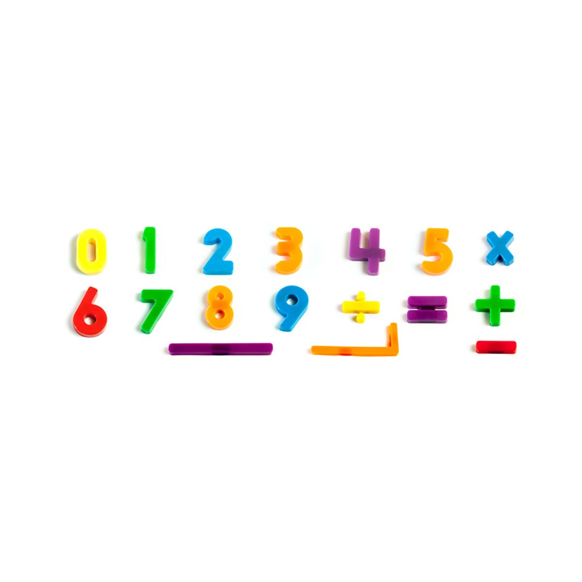 Complete assortments of magnetic numbers from 0 to 9 accompanied by mathematical signs to encourage initiation in basic arithmetic. For use on metallic blackboards.
