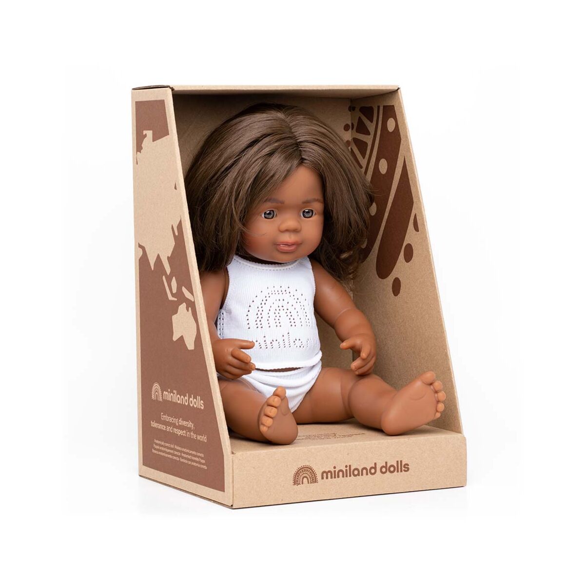 Miniland doll with native Australian Aboriginal features. This doll belongs to our Miniland Dolls collection that promotes the value of equality within kids regardless of their origin, gender or condition and allows them to also learn about the diversity in all of us and how to develop social skills such as empathy and tolerance.