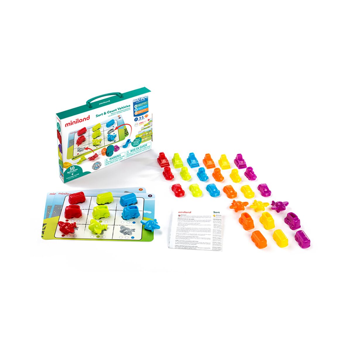 1 teaching guide, 36 vehicles & a collection of 5 double-sided cards.