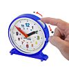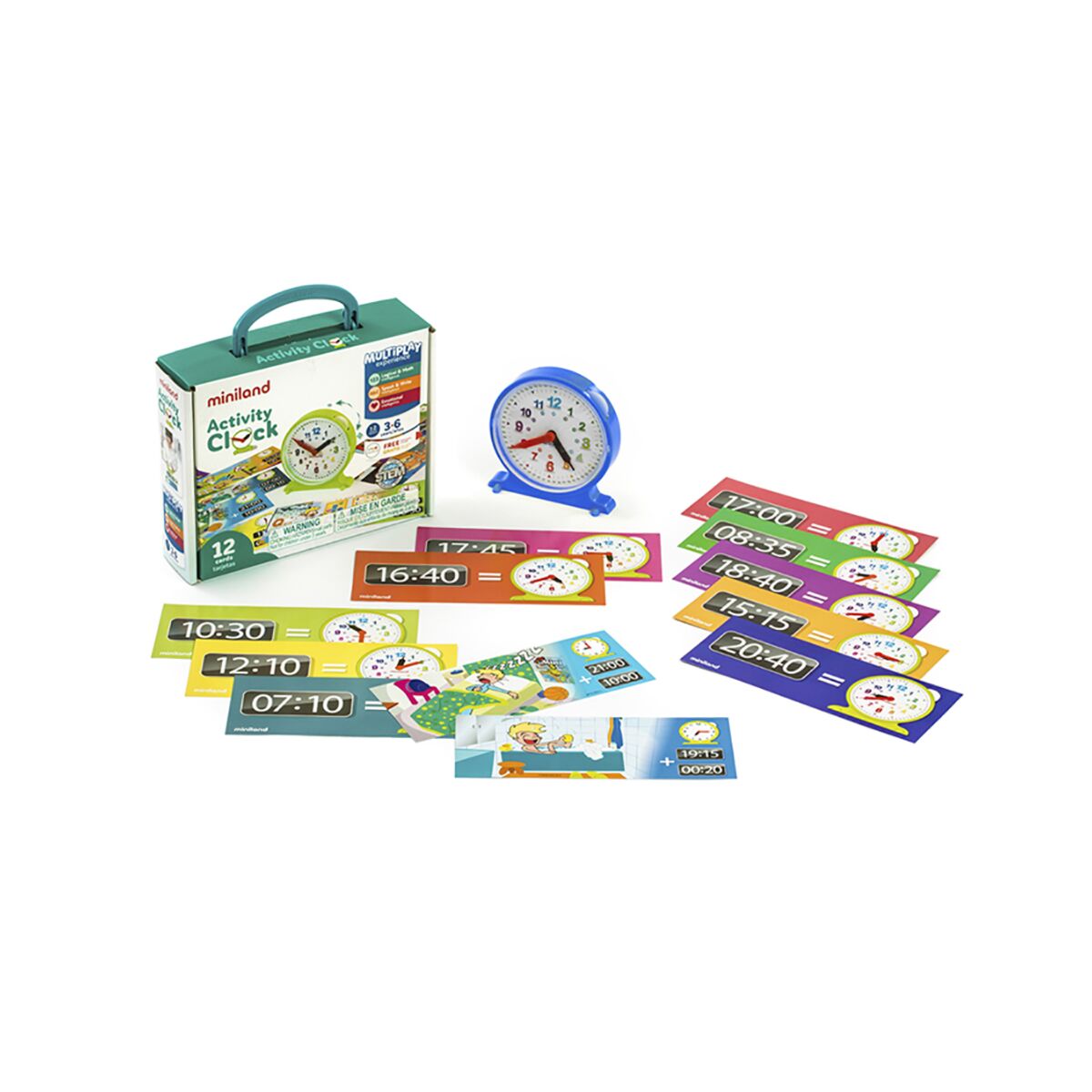 Activity clock es un recurso que ayuda entender las unidades de medida del tiempo horas y minutos, facilitando a los niños la comprensión del paso del tiempo de una manera lúdica. De dimensiones adecuadas y fabricado en resistente plástico cuenta con una rueda lateral que permite ser manejado de manera autónoma por el niño. La esfera está dividida en horas y minutos con números claros y de diferentes colores. Está acompañado de 12 fichas entorno a las actividades diarias del niño para leer las hora de manera analógica y digital.