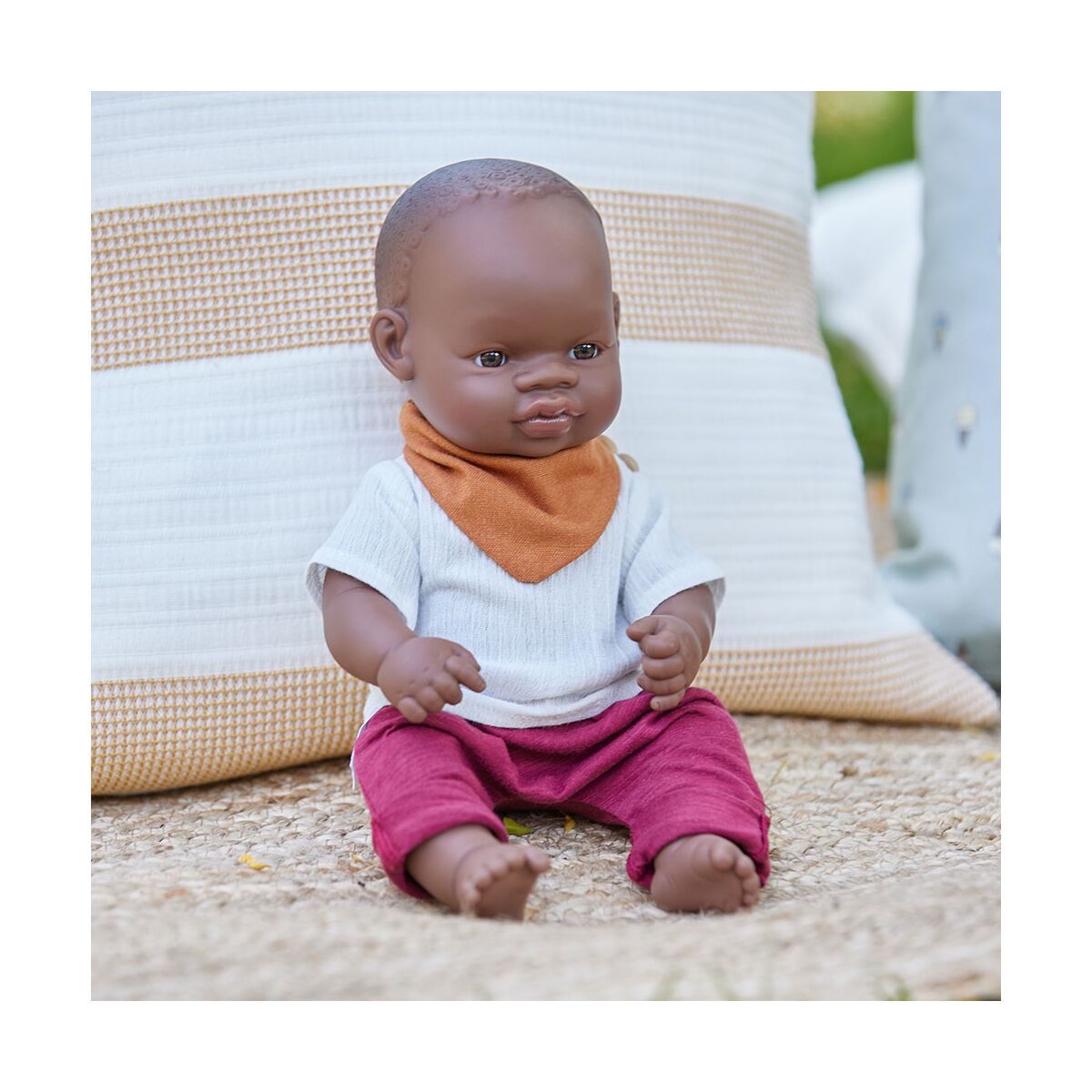 Desde Miniland fomentamos la empatía, la tolerancia y el respeto por los demás porque sabemos la importancia de que todos los niños se sientan incluidos y comprendan la diversidad de nuestra sociedad. Los muñecos de Miniland representan a personas de distintos orígenes, condiciones y géneros, de forma que todos los niños puedan verse reflejados en ellos. El muñeco de origen africano con ojos marrones mide 32 cm y está fabricado artesanalmente en España a base de un material de vinilo suave con aroma a vainilla. Además, ¡es articulado! Sus brazos y piernas se pueden girar.