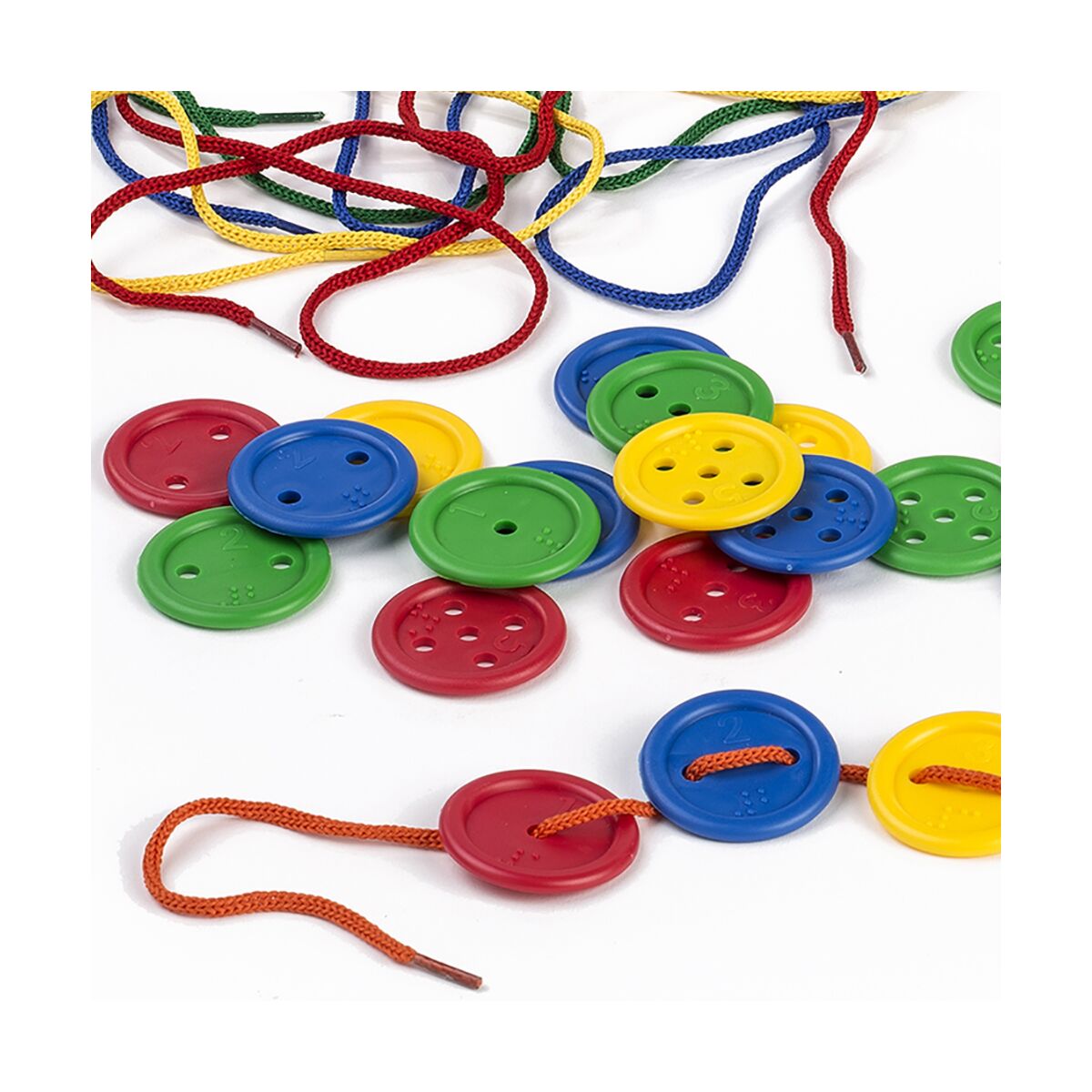 Juego de ensartar, con grandes botones de 1 a 5 agujeros y en vivos colores. Para seriación y clasificación. Estimulan la motricidad fina del niño. Incluyen en relieve la grafía del número y también su representación en braille.