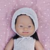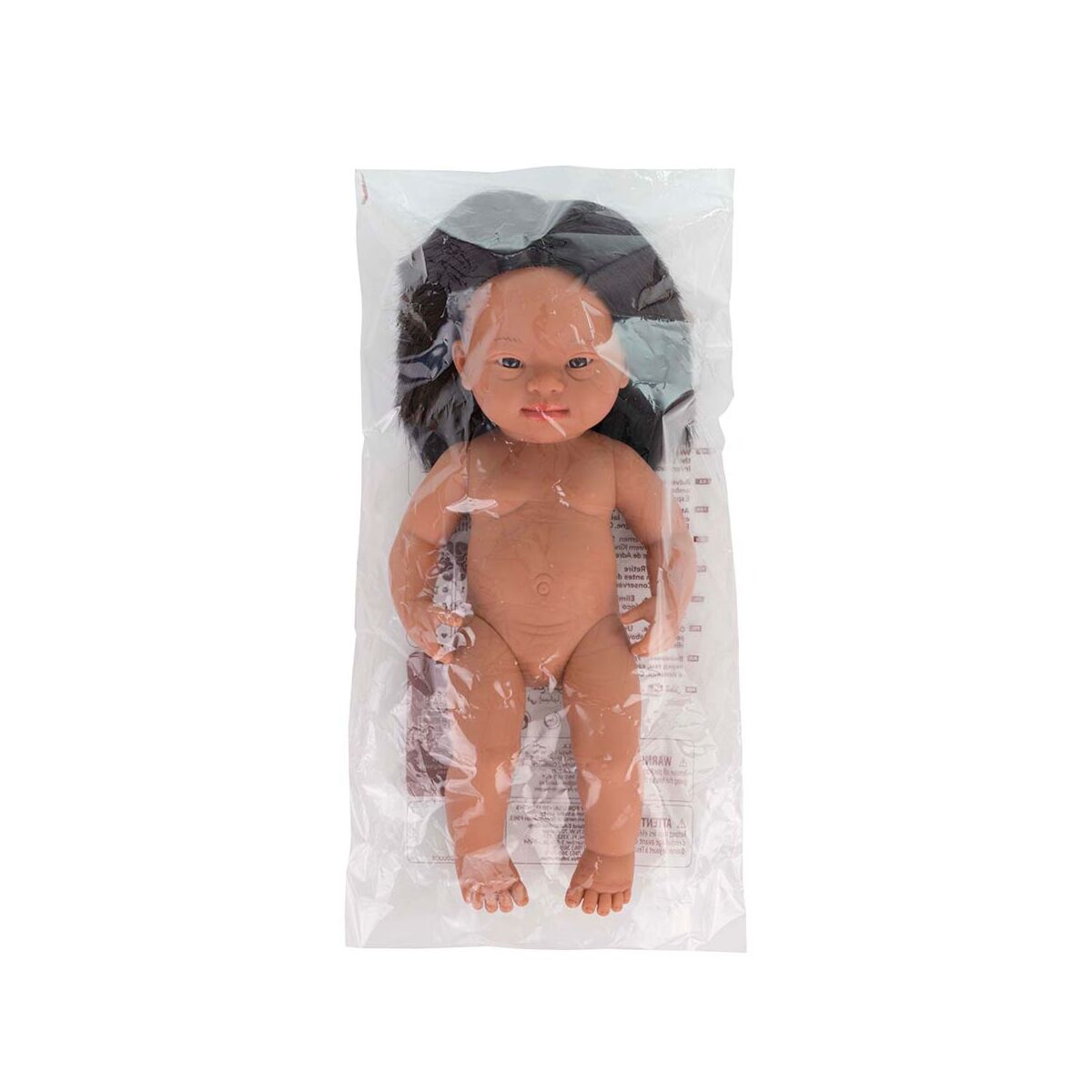 La muñeca de origen latinoamericano con Síndrome de Down tiene pelo oscuro, piel morena y ojos marrones. La colección Miniland Dolls de la que forma parte fomenta valores como el respeto y la tolerancia hacia las personas de nuestro entorno. Es articulada y anatómicamente correcta, para que los niños puedan distinguir entre distintas condiciones, géneros y orígenes. Mide 38 cm y está realizada a base de vinilo.
