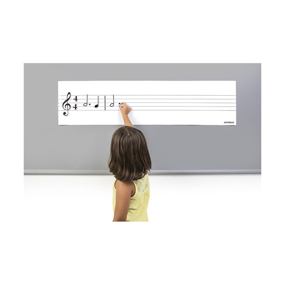 Pizarra musical pautada cuya parte trasera se adhiere sobre cualquier superficie plana. Se puede quitar y poner las veces que sea necesario, con la tranquilidad de que no deja residuo, al ser removible y reutilizable. Incluye 85 figuras musicales magnéticas para crear composiciones sobre el pentagrama. Permite la escritura con un rotulador borrable (no incluido).