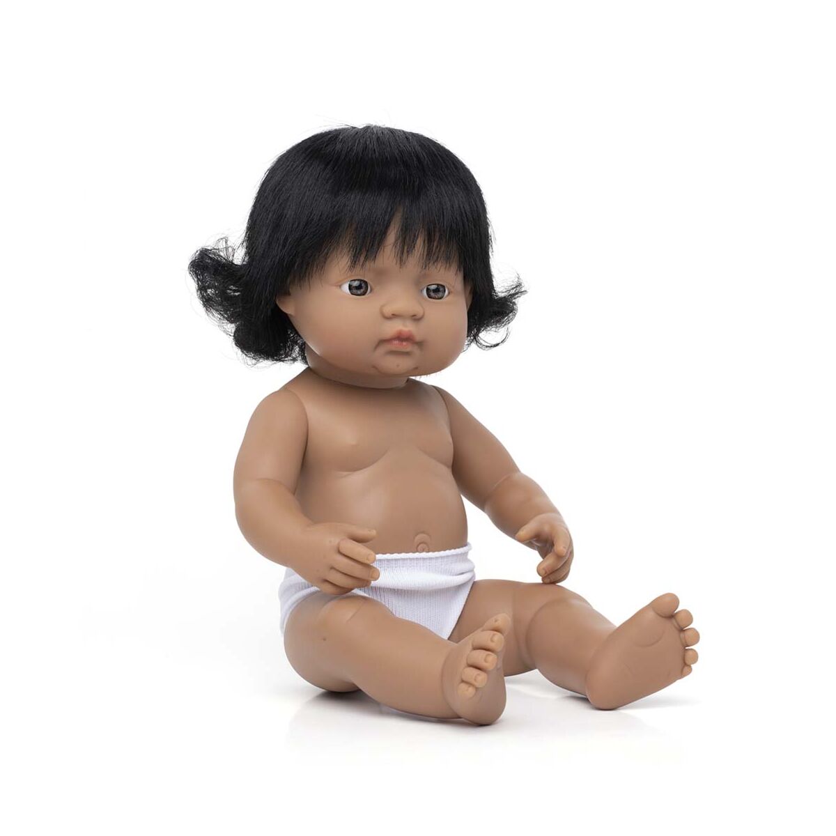 Miniland doll with Hispanic features. This doll belongs to our Miniland Dolls collection that promotes the value of equality within kids regardless of their race, gender or condition and allows them to also learn about the diversity in all of us and how to develop social skills such as empathy and tolerance.