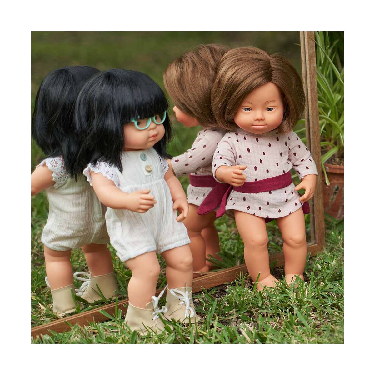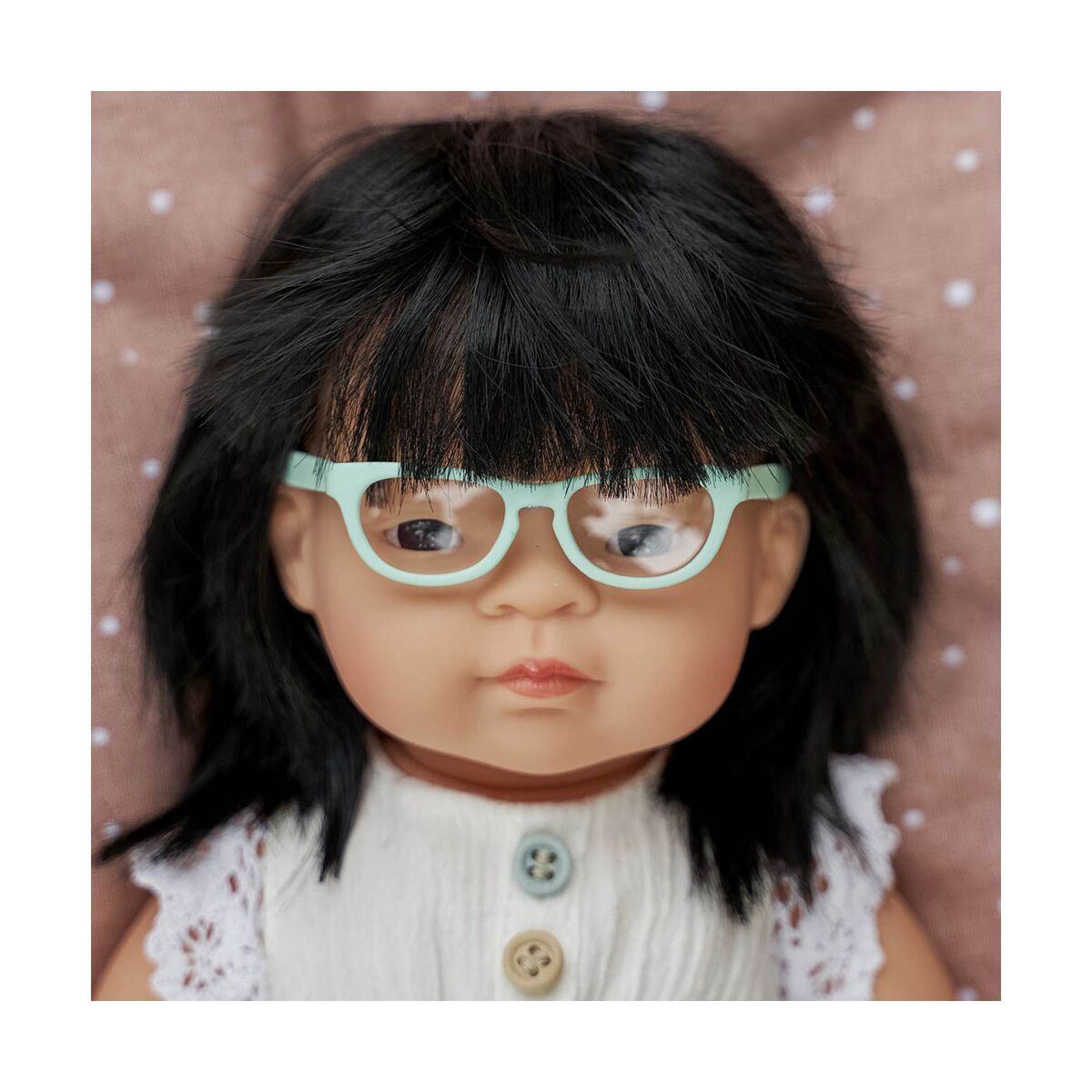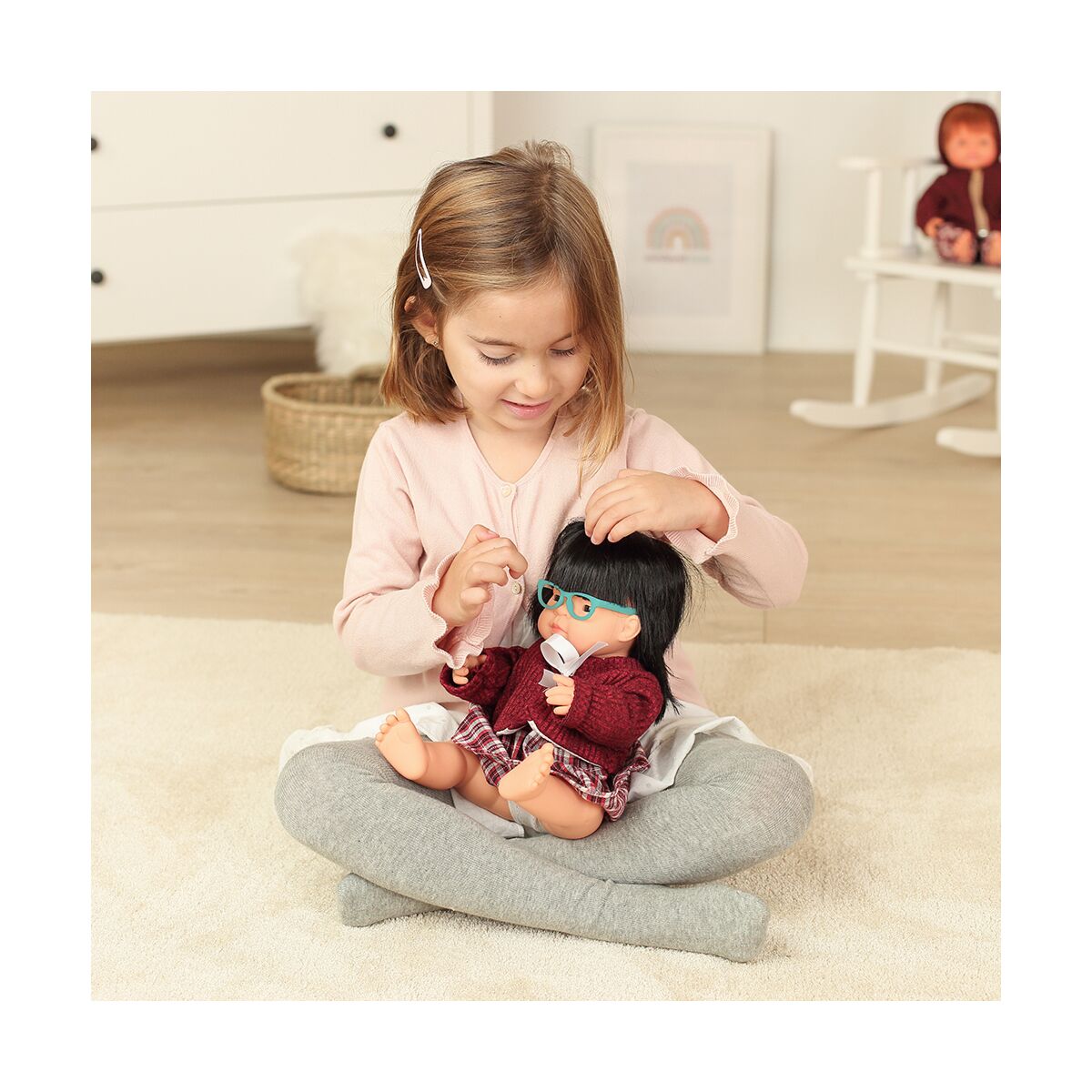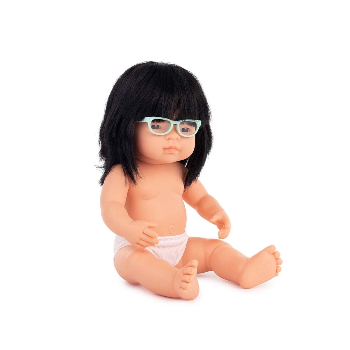 Miniland doll with Asian features. This doll belongs to our Miniland Dolls collection that promotes the value of equality within kids regardless of their race, gender or condition and allows them to also learn about the diversity in all of us and how to develop social skills such as empathy and tolerance. This doll is visually impaired and includes eyeglasses.Made of high-quality soft vinyl with a light vanilla scent. This doll is also recyclableMade in SpainAnatomically correct doll with realistic differences between boy and girl dollsArticulated head, arms and legs that can fully rotate allowing the doll to sit, stand or lie downDoll is washable and it will not affect their quality and durabilityIt is 15 inches longCan be dressed with our Miniland’s clothing collection to complete its lookComes individually packaged in a polybag with underwear
