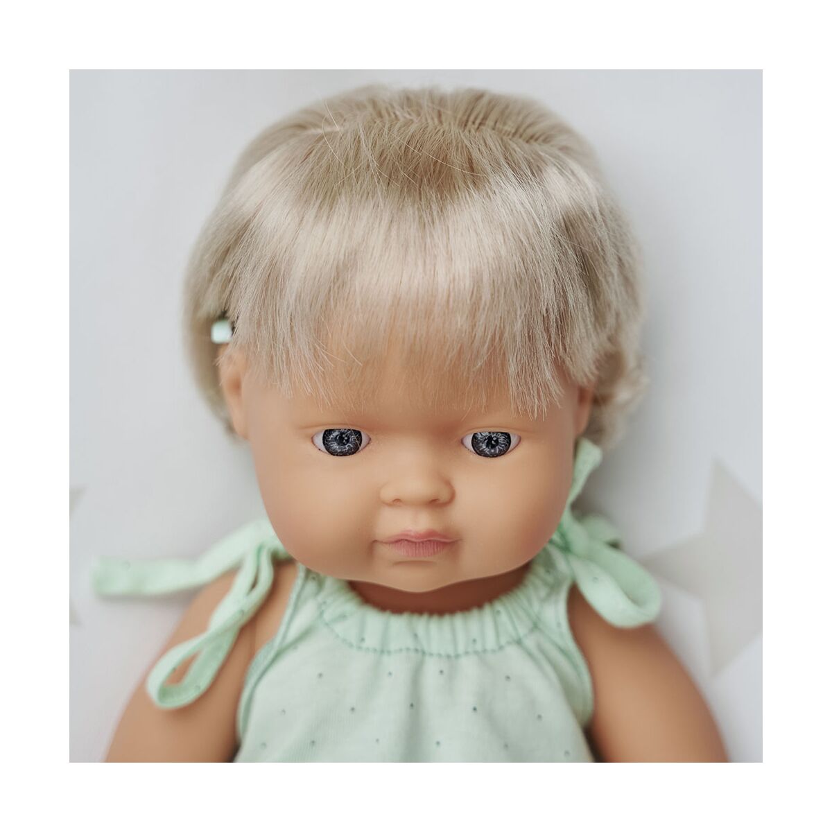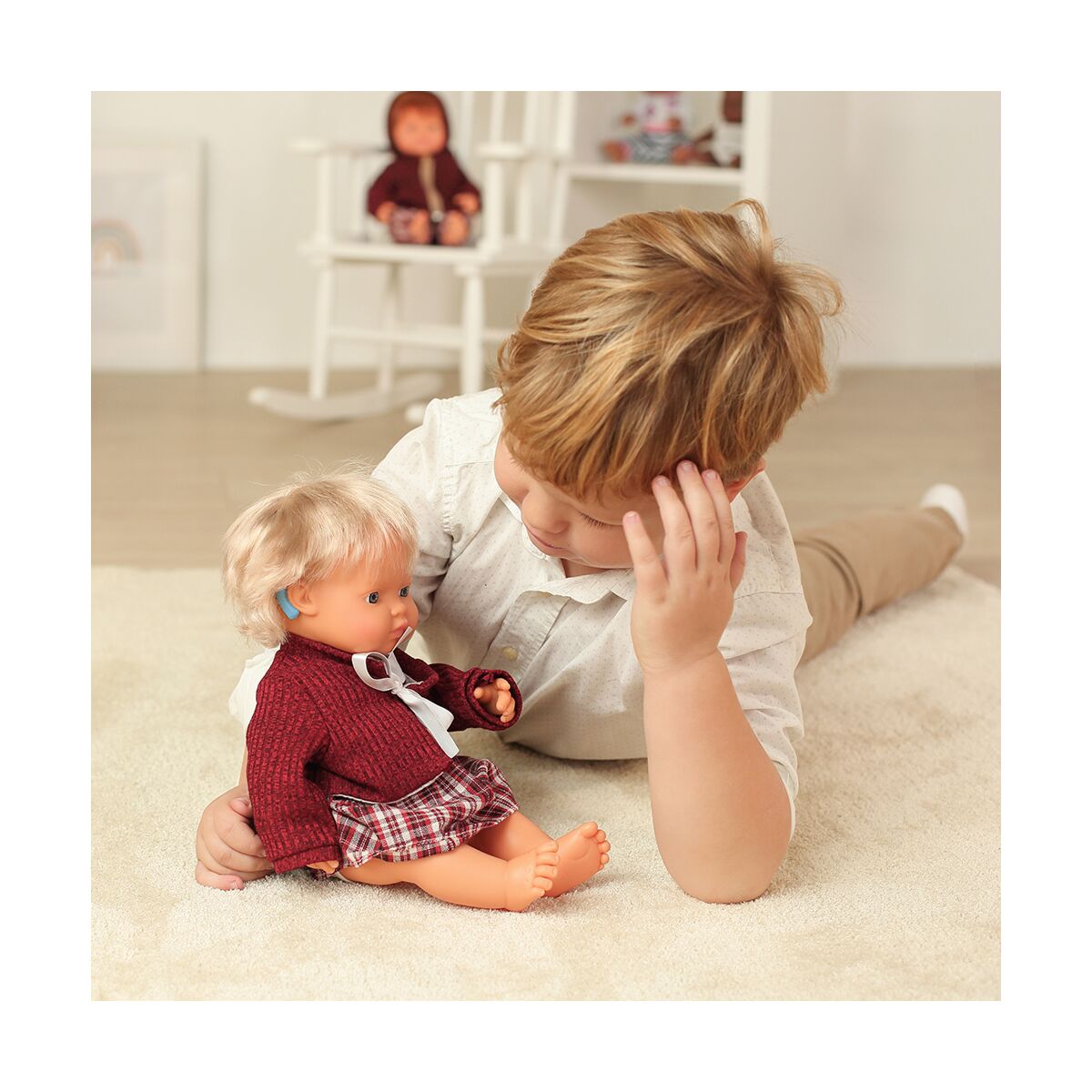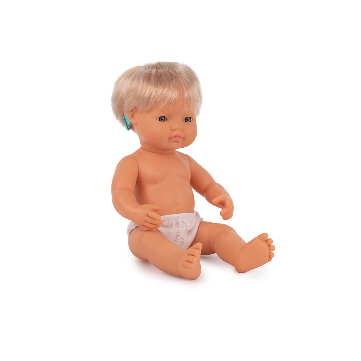 Miniland doll with the Caucasian characteristics of blonde hair and blue eyes. This doll belongs to our Miniland Dolls collection that promotes the value of equality within kids regardless of their race, gender or condition and allows them to also learn about the diversity in all of us and how to develop social skills such as empathy and tolerance. This doll is hearing impaired and includes a hearing aidMade of high-quality soft vinyl with a light vanilla scent. This doll is also recyclableMade in SpainAnatomically correct doll with realistic differences between boy and girl dollsArticulated head, arms and legs that can fully rotate allowing the doll to sit, stand or lie downDoll is washable and it will not affect their quality and durabilityIt is 15 inches longCan be dressed with our Miniland’s clothing collection to complete its lookComes individually packaged in a polybag with underwear