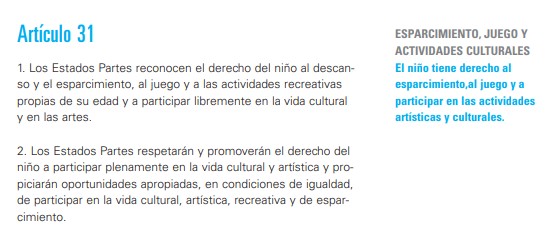 Quizá pocas personas saben que el juego es un derecho reconocido en la Convención sobre los Derechos del Niño. El artículo 31 menciona "el derecho del niño al descanso y al esparcimiento, al juego y a las actividades recreativas propias de su edad y a participar libremente en la vida cultural y en las artes".