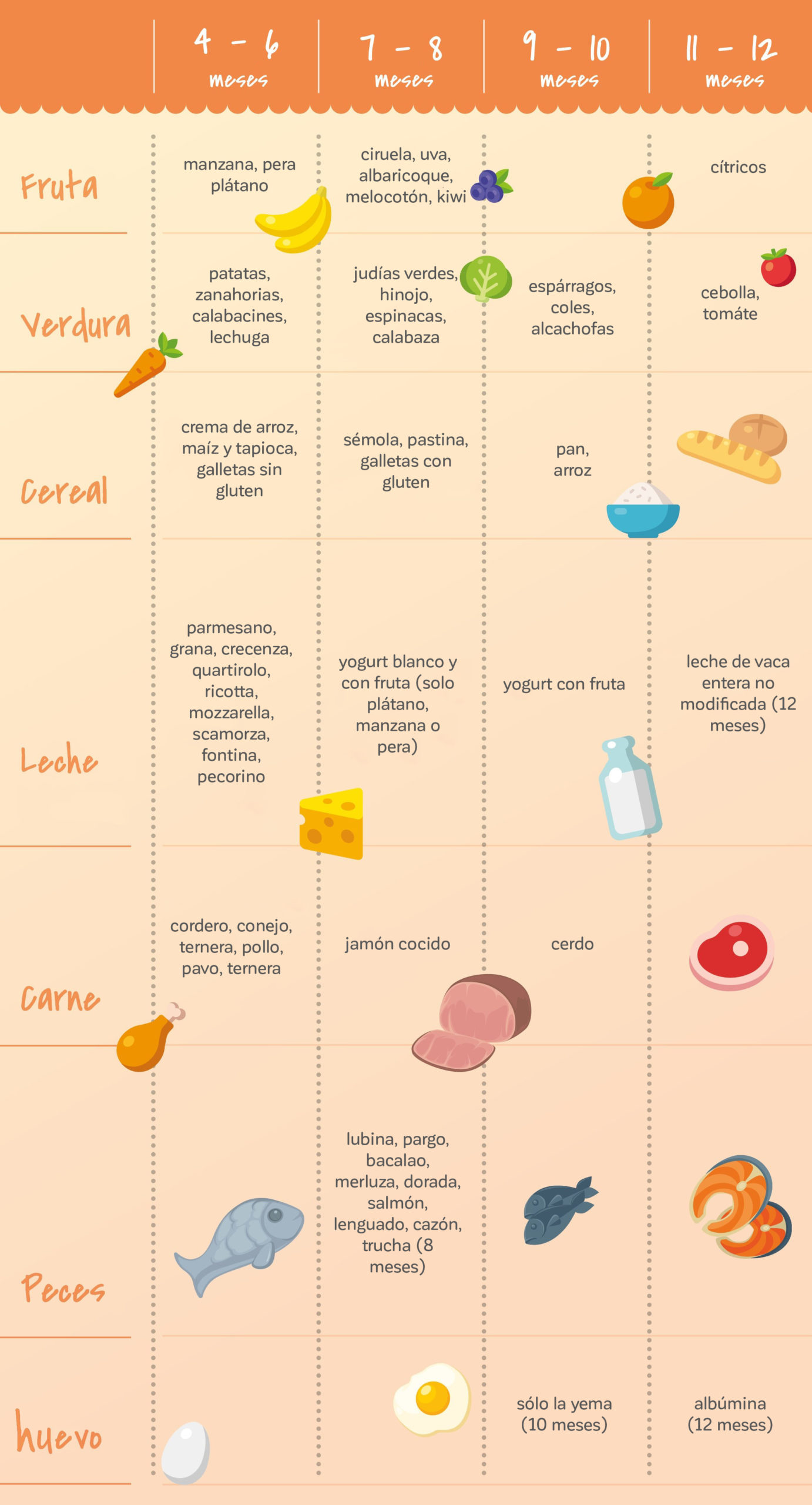 A continuación, se presenta una tabla sobre el destete de tu bebé recién nacido, que te ayudará a entender cuándo introducir los distintos tipos de alimentos en la dieta de tu bebé: puede ser útil como guía indicativa durante la fase de destete.
