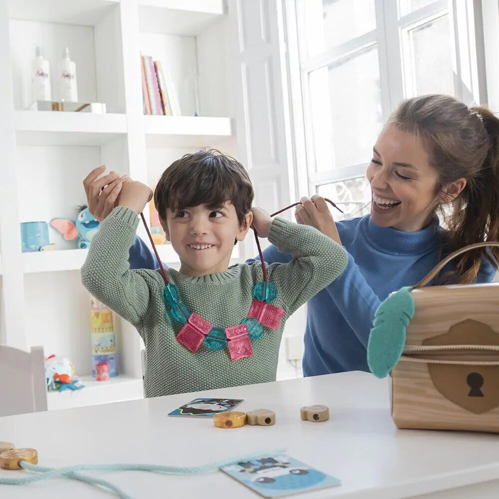 Nuestro cofre del tesoro para hacer collares es ideal para los niños de 3 a 6 años. Desarrollarán su creatividad, tendrán para siempre un souvenir de este día, ¡y podrán presumir de su valiosa joya! Pueden decorarlo con rubíes, monedas, diamantes...