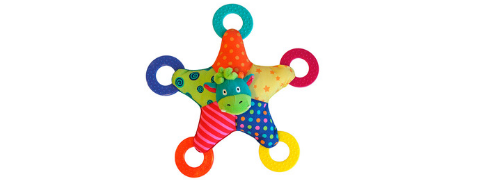 - Moogy Mordedor: se trata de un mordedor de gran tamaño, muy fácil de manipular. Tiene forma de estrella y en los extremos presenta unos aros flexibles con diferentes texturas, para aliviar y estimular la dentición.