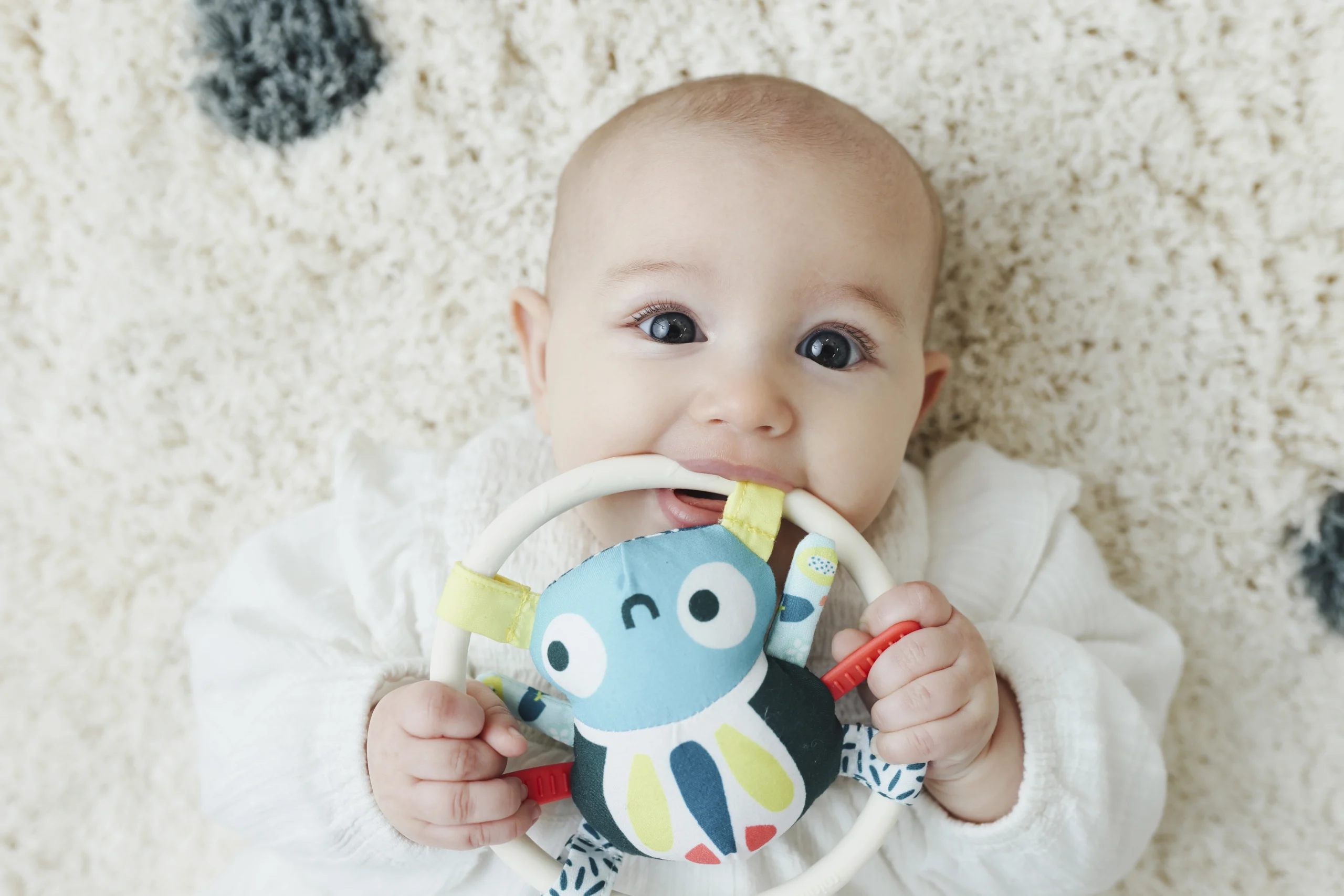 Por eso, dentro de nuestra colección Feel to Learn para la etapa de 0 a 6 meses, encontrarás desde un divertido sonajero mordedor con forma de araña, hasta cubos apilables con sonajero interior y papeles de colores contrastados de sonidos crujientes.