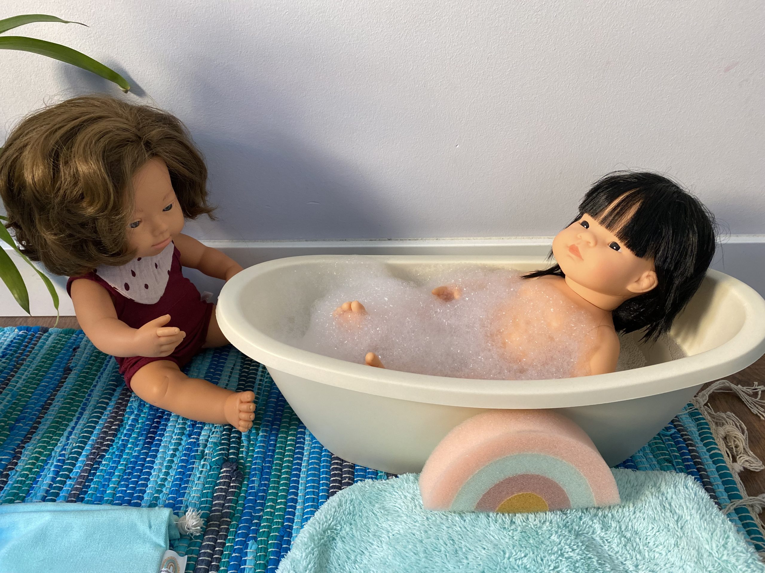 En las escuelas Montessori se utilizan muñecos para plantear una actividad del área de vida práctica que enfocada en que los niños aprendan a cuidar de su propia higiene personal: bañarse.