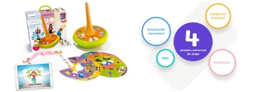 La mejor herramienta para realizar ejercicios prácticos de mindfulness en el aula es Mindful Kids. Mindful Kids es un juego que consiste en una peonza gigante en la que se incrustan discos con diferentes actividades de mindfulness. Al rodar la peonza, ésta se apoya sobre uno de sus 6 lados, y en cada lado hay una actividad. Los niños tienen que ir ejecutando las actividades que marca la peonza, siempre con la guía de su profesor.
