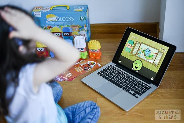 Luego con el ordenador nos hemos conectado a la web de Play Miniland y siguiendo las fichas y los edificios hemos adivinado qué profesión era en cada momento y hemos ido vistiendo a los personajes con sus uniformes y sombreros desde el ordenador. Cuando sale la carita contenta los peques se sienten muy gratificados. Lo más divertido es que se puede cambiar la velocidad del juego desplazando una palanca izquierda que aparece en la pantalla, con lo hacer el match es cada vez más emocionante.