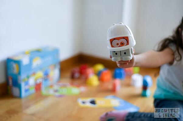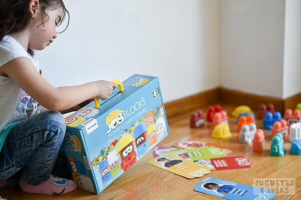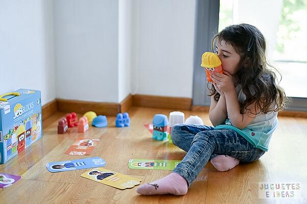 Pero vayamos por partes. Emotiblocks es uno de los juegos que más premios ha recibido. Gracias a él puedes hablar de forma divertida con los peques de qué son las emociones y cómo se representan. El juego integra 6 personajes que se tienen que construir a piezas (cara, cuero y pelo) de manera muy sencilla. Los niños tienen que ser capaces de identificar si hay alegría, tristeza, sorpresa, enfado, miedo o aburrimiento en sus caras. Imaginad 51 niños poniendo carita triste, carita alegre, de enfado o miedo emulando a los personajes. Nos quedamos gratamente sorprendidos porque todos sabían reconocer y expresar estas emociones.