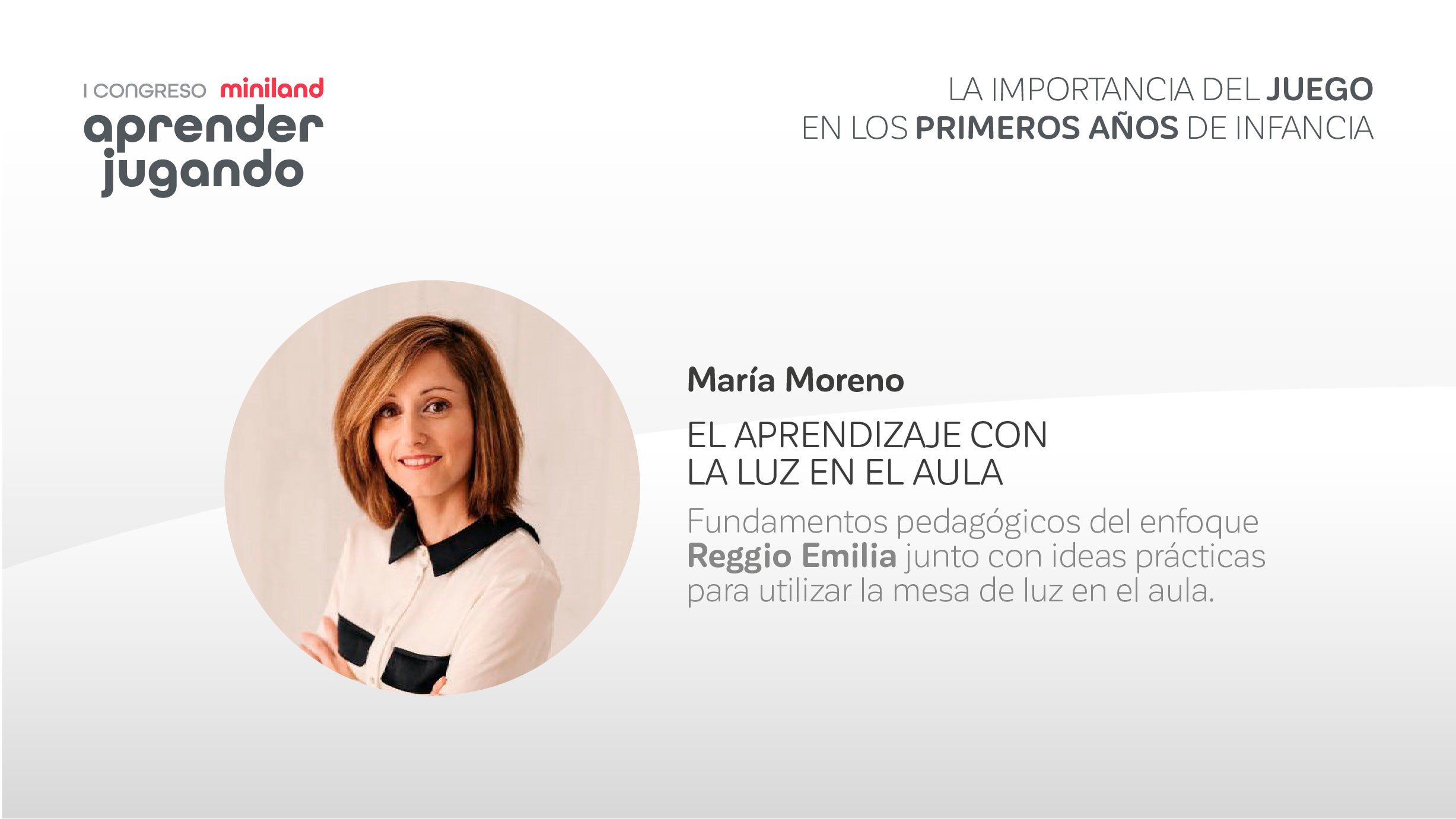 María Moreno es profesional de las pedagogías activas, asistente Montessori y experta en pedagogía de la luz y mesa de luz. También imparte cursos presenciales y online, formadora en Red Educativa y escritora del libro “La mesa de luz”.