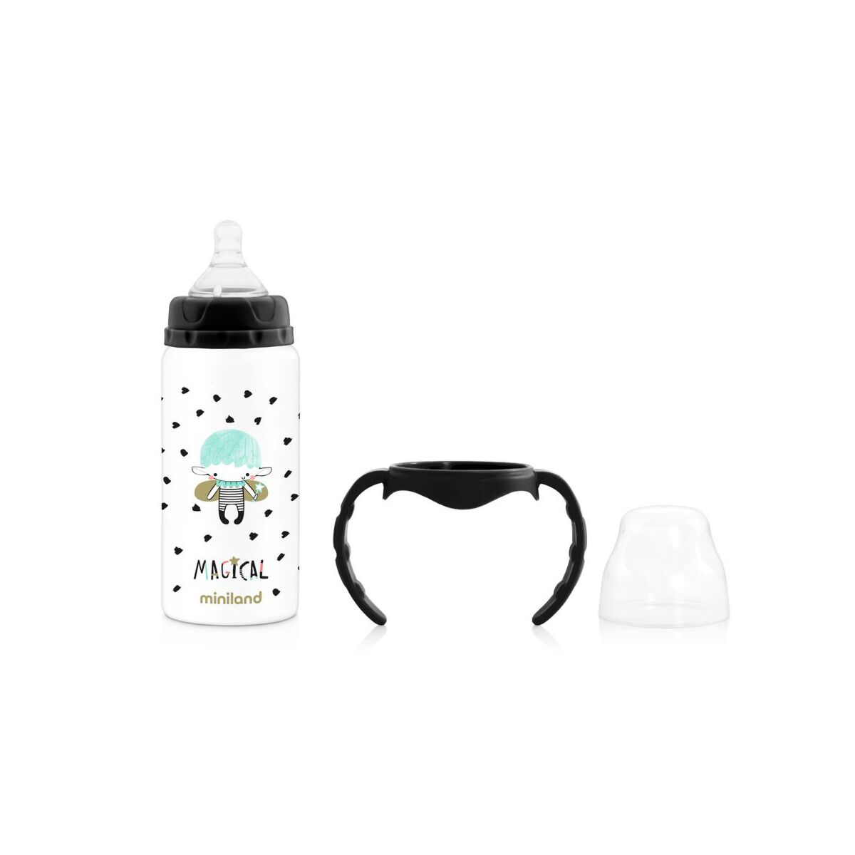 thermobaby es una botellita térmica de acero inoxidable 304 con tetina y capacidad de 240ml que conserva la temperatura de la bebida durante más tiempo gracias a su doble pared de acero. Además, cuenta con asas laterales, ideales para que el bebé pueda asirlas con sus pequeñas manos.