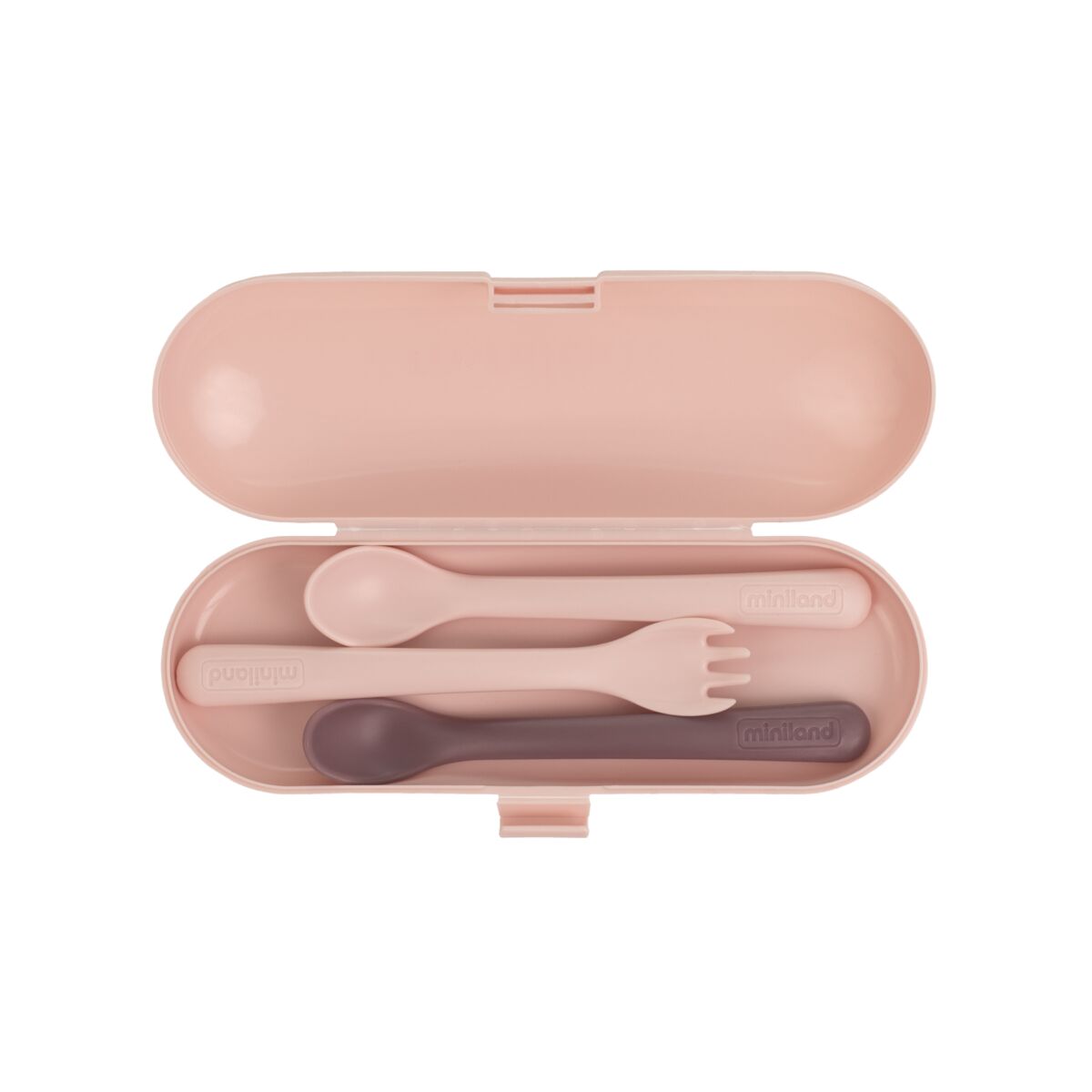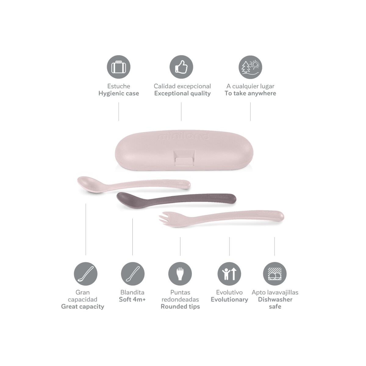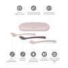 Set de cubiertos anatómicos y evolutivos para todas las etapas del bebé. En él, encontrarás 2 cucharas con diferentes capacidades y durezas (una rígida y otra más blandita), junto a un tenedor de puntas redondas y un cómodo estuche protector. En un bonito color blush y apto para lavavajillas.