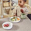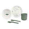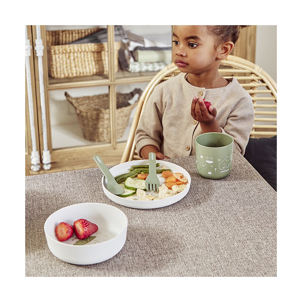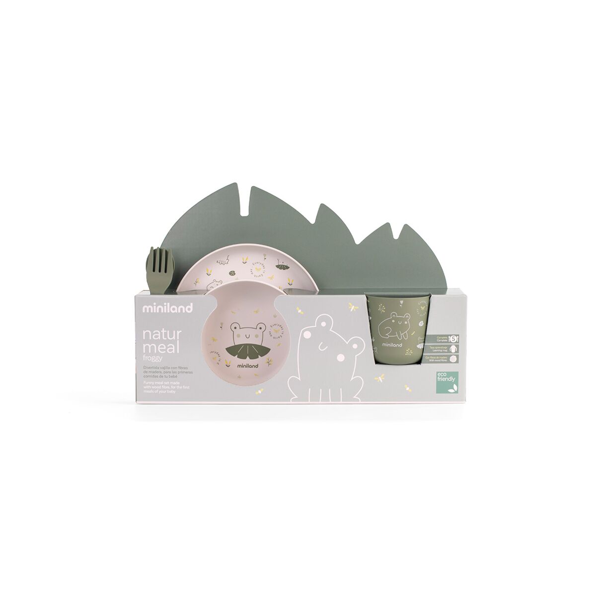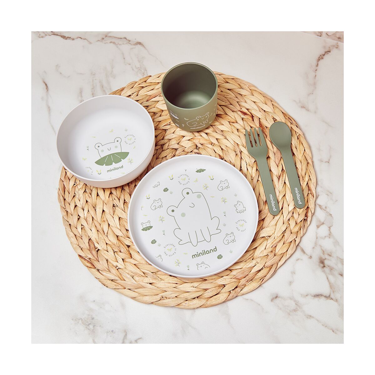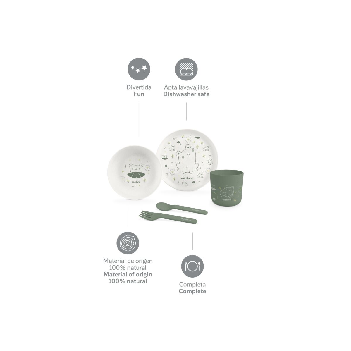 Vom Bauernhof auf Ihren Esstisch.Ein vollständiges Geschirrset mit Frosch- oder Kükenmotiven für die kleinsten Mitglieder des Hauses. Es besteht aus 5 Teilen (Teller, Schüssel, Glas, Gabel und Löffel) und ist aus 100% natürlichen, biobasierten Materialien hergestellt. Die Größe des Geschirrs ist so konzipiert, dass die Kleinen das Essen eigenständig genießen und etwas über Lebensmittel lernen können.