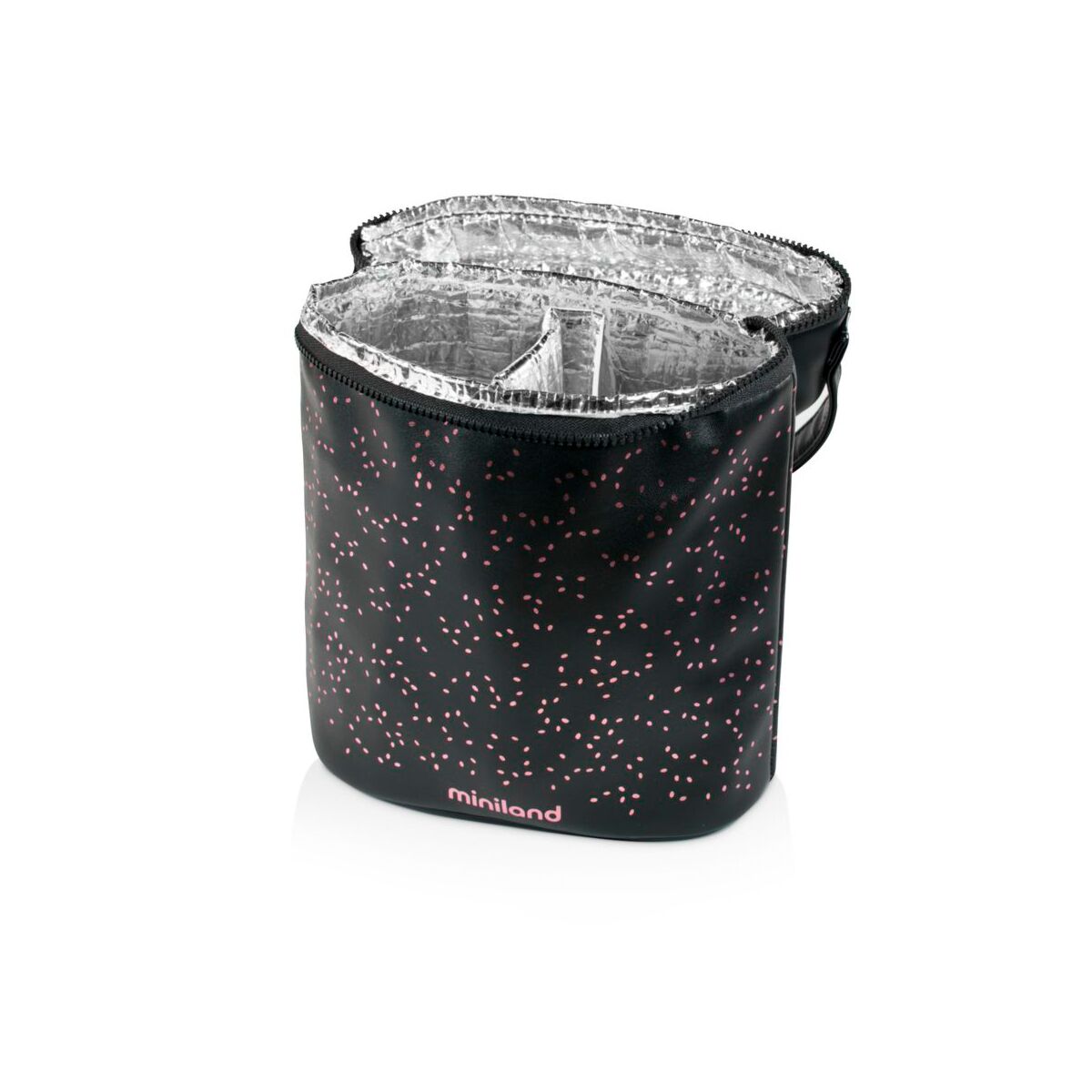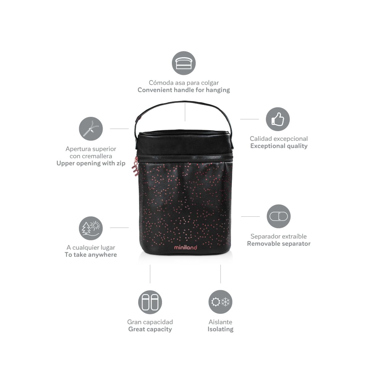 Praktische isotherme Doppeltasche für Thermos und Fläschchen. Mit einer zusätzlichen Schicht zum Schutz der Thermos vor Änderungen der Umgebungstemperatur und zum längeren Erhalt der Ausgangstemperatur.