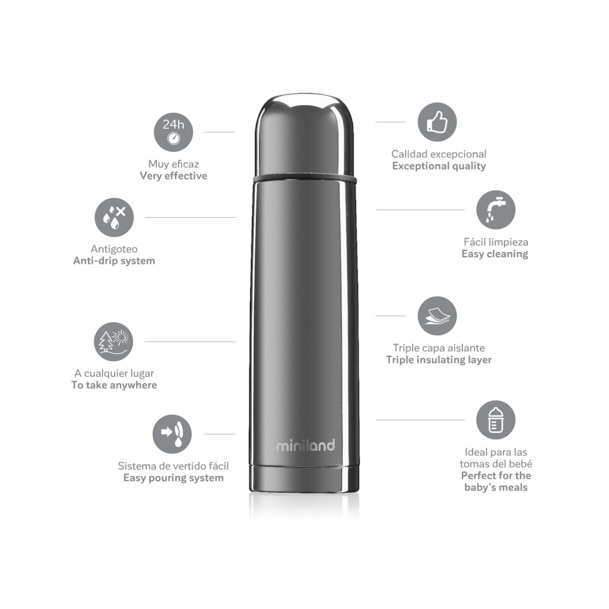 Dank ihrer doppeltenStahlwand, ihrer exklusiven Aluminiumbeschichtung und ihrer Vakuumkammer sinddie Thermobehalter der Serie thermys deluxe von Miniland sehr widerstandsfahigund effizient.
