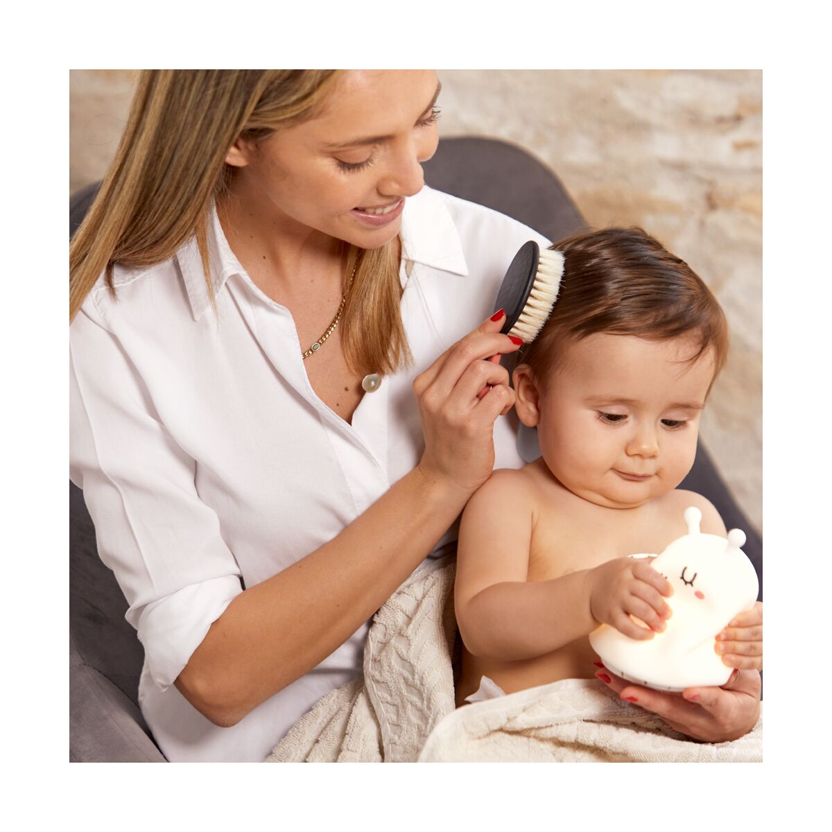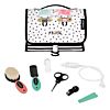 This fun magical baby care kit includes all the essentials for your little one’s daily care and hygiene: a comb and natural bristle brush, scissors, nail clippers and two fi les for manicuring their nails, a nasal spray and a silicon brush for cleaning their wee teeth and massaging their gums.