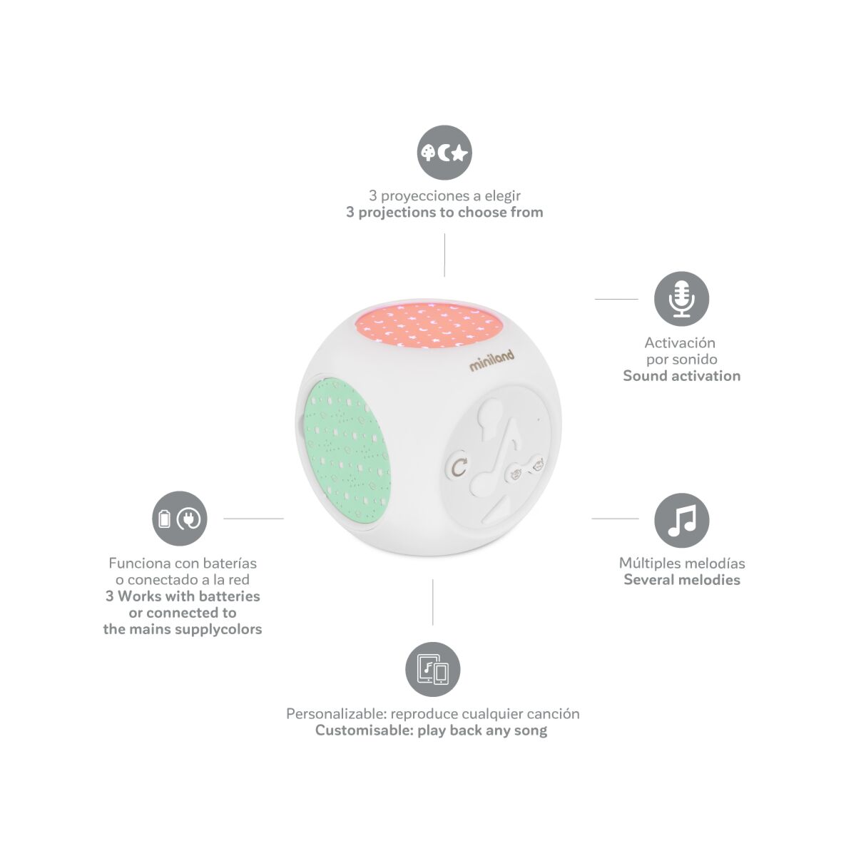Dreamcube adapts to the needs of each baby and parent. Melodies and projections can be used combined or independently, so that the baby can enjoy only the projection, the music or the combination of both as desired.