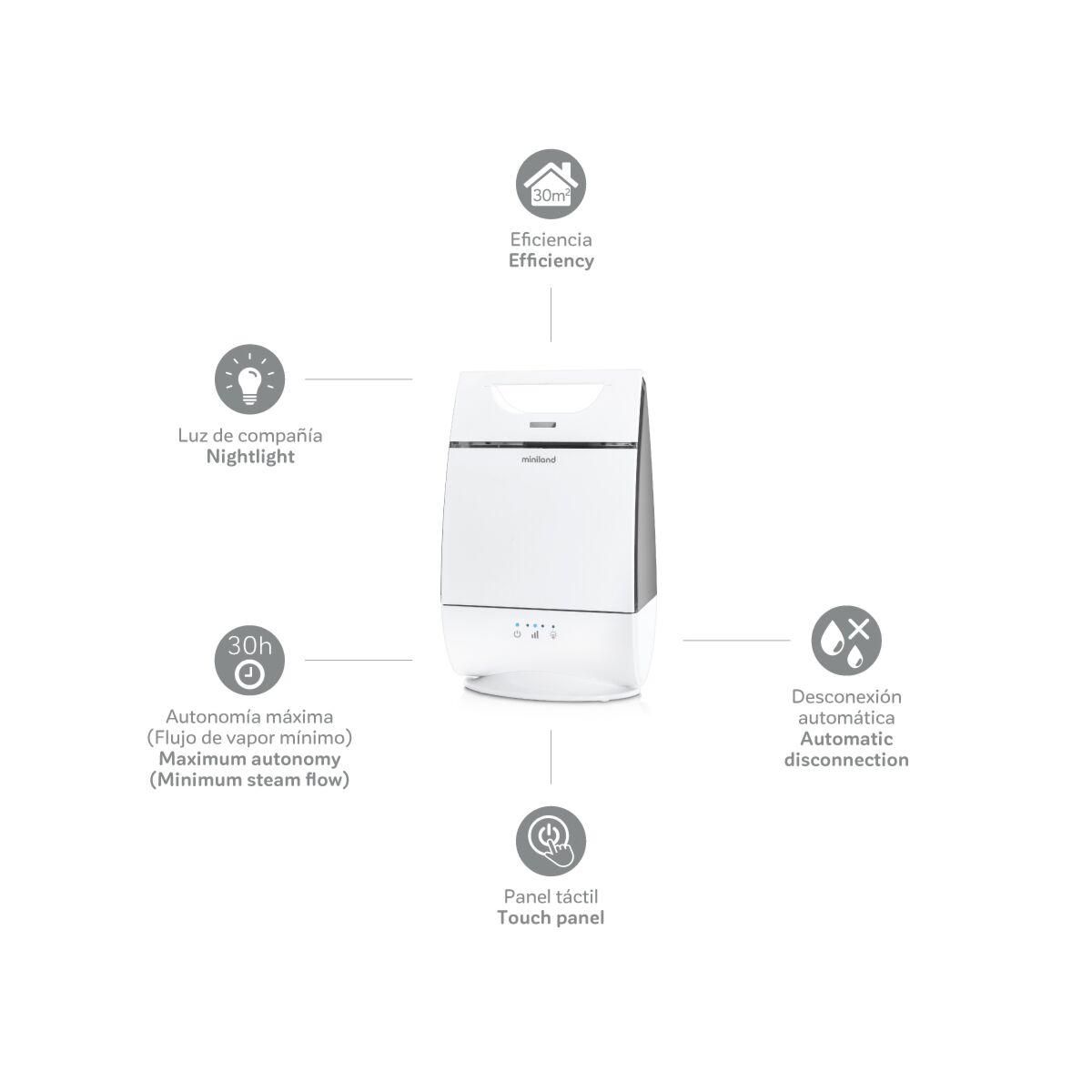 Compact, with maximum autonomy and efficiency. Humitouch is a cold steam humidifier, stylishly designed and compact as well as easily portable with maximum autonomy up to 50 hours. Its touch panel allows you easily and simply to control the uniform flow of steam you want at all times, even in large rooms (30 m2).