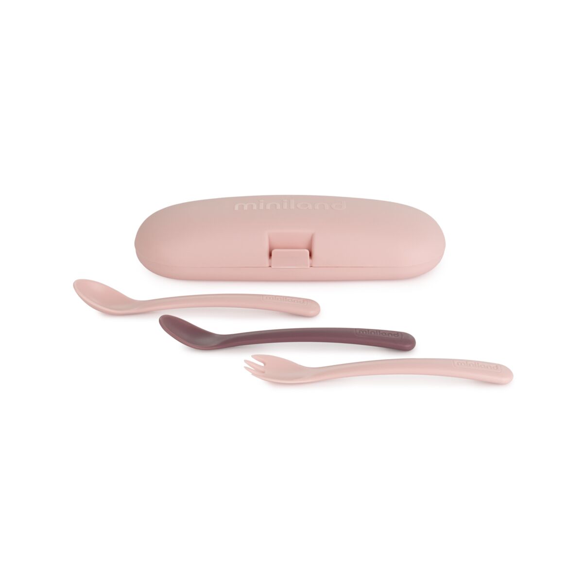 Set of anatomical and evolutionary cutlery for all stages of your baby's development. In it, you'll find 2 spoons with different sizes and hardness (one rigid and one softer), along with a round-pronged fork and a convenient protective case. In a pretty blush colour and dishwasher safe.