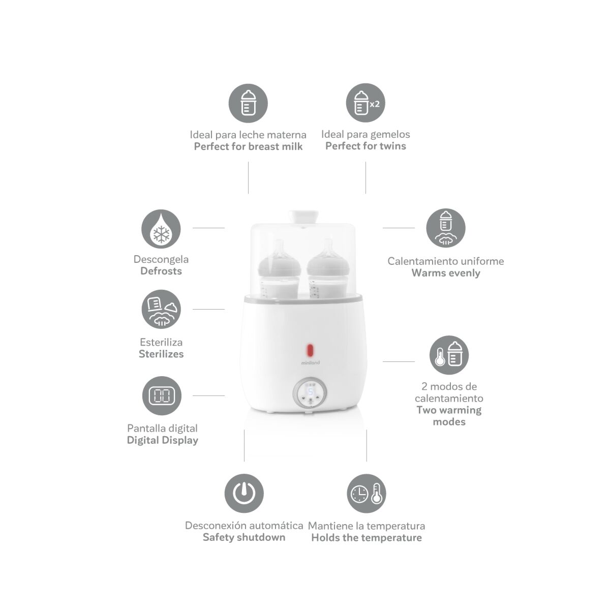 Warms naturally using high temperature steam, meaning that the milk and baby food reach a uniform temperature suitable for the baby, therefore avoiding the disadvantages of other methods such as microwaves.