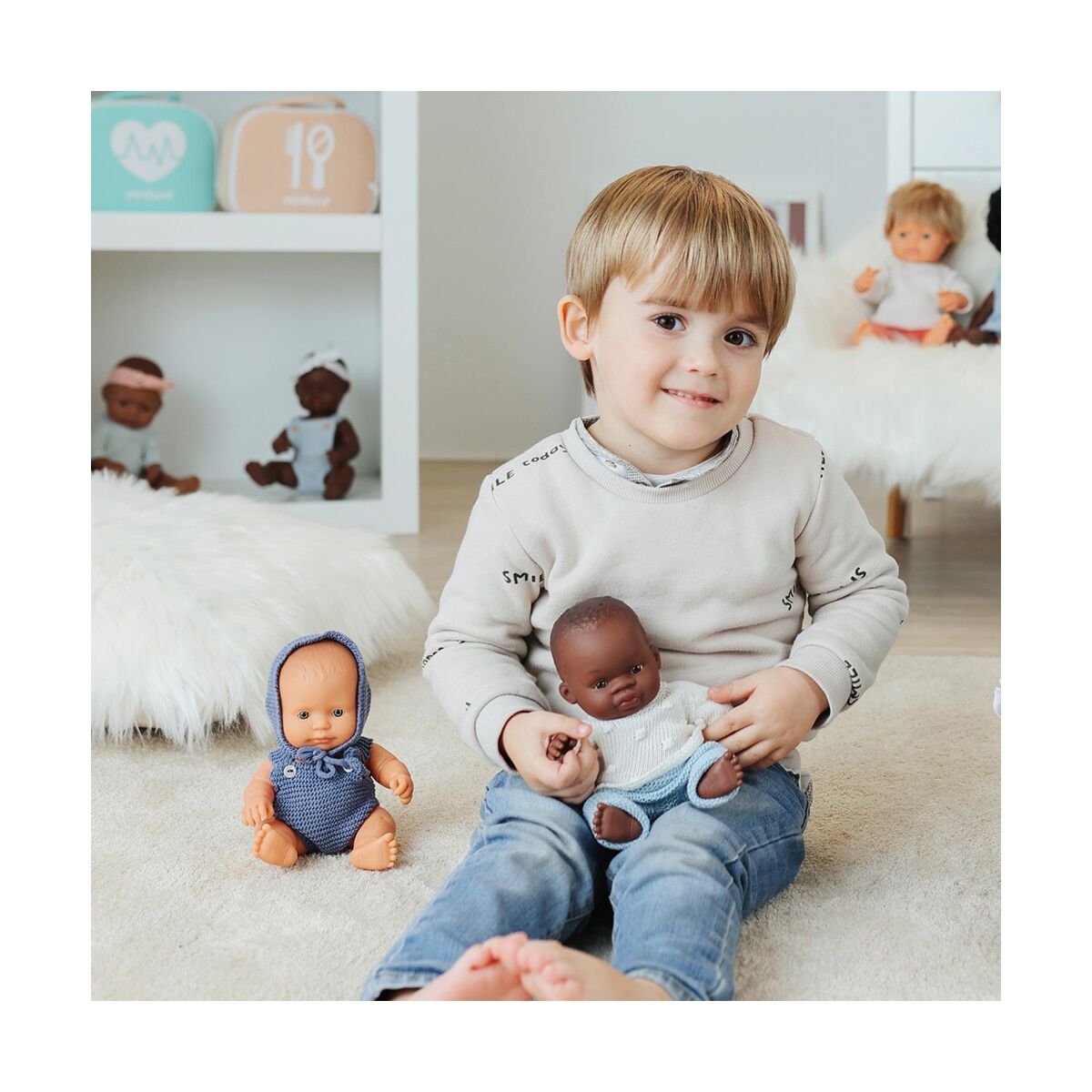 Un joli ensemble de vêtements tricotés pour poupées de 21 cm, avec un pull et un pantalon. Découvrez notre ensemble de vêtements tricotés pour poupées de 21 cm, qui comprend un pull gris clair et un pantalon bleu ciel. Faisant partie de la nouvelle collection Miniland Dolls, cet ensemble est fabriquéàpartir de matériaux recyclés, avec des teintes naturelles et un charmant style fait main.