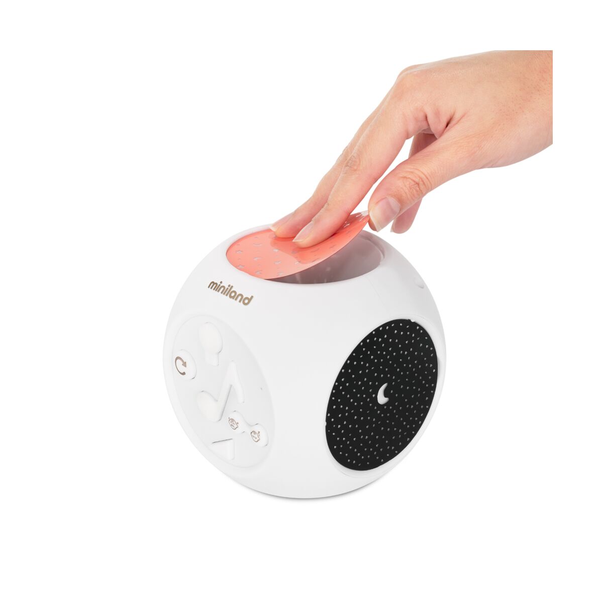 Un projecteur de sommeilcomplet, avec des sons et des mélodies. Dreamcube vous aidera à vous détendreet à endormir votre bébé grâce à la combinaison de lumières et de motifs douxqu'il projette au plafond et à ses douces berceuses et sons. Dreamcube disposeégalement d'une activation sonore et vous permet de configurer ses projectionset ses mélodies selon les préférences de votre bébé.