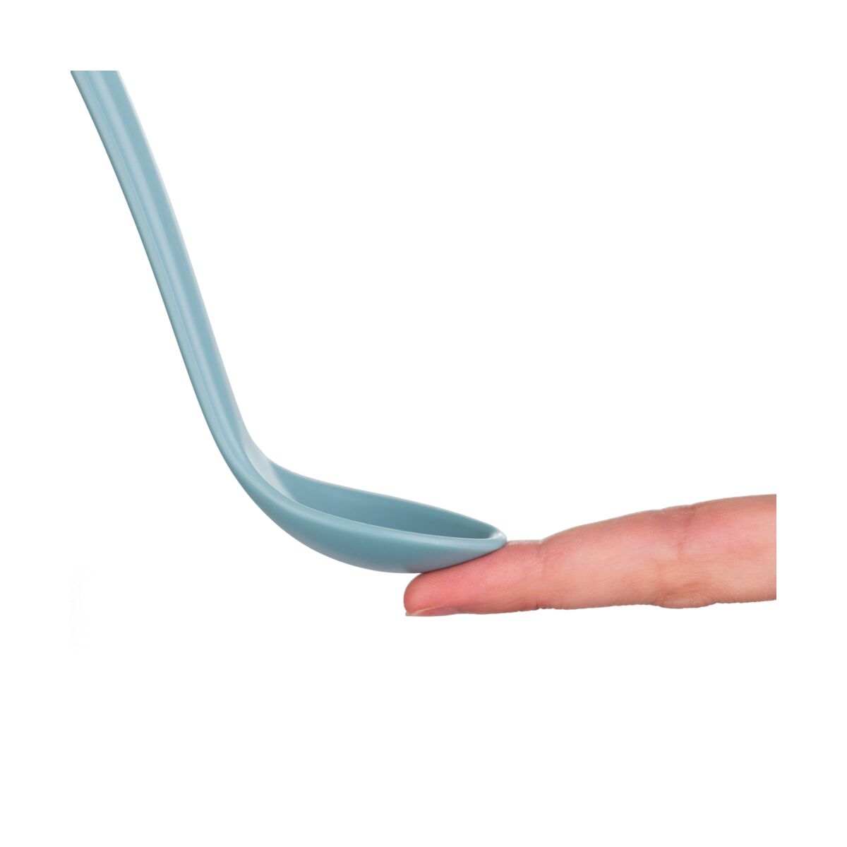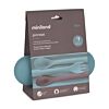 Set de couverts anatomiques évolutifs avec étui de protection. Contient deux cuillères (une souple et une plus dure) et une fourchette à bouts arrondis, toutes adaptées au contact avec les gencives de votre bébé. D'une belle couleur océan et allant au lave-vaisselle.