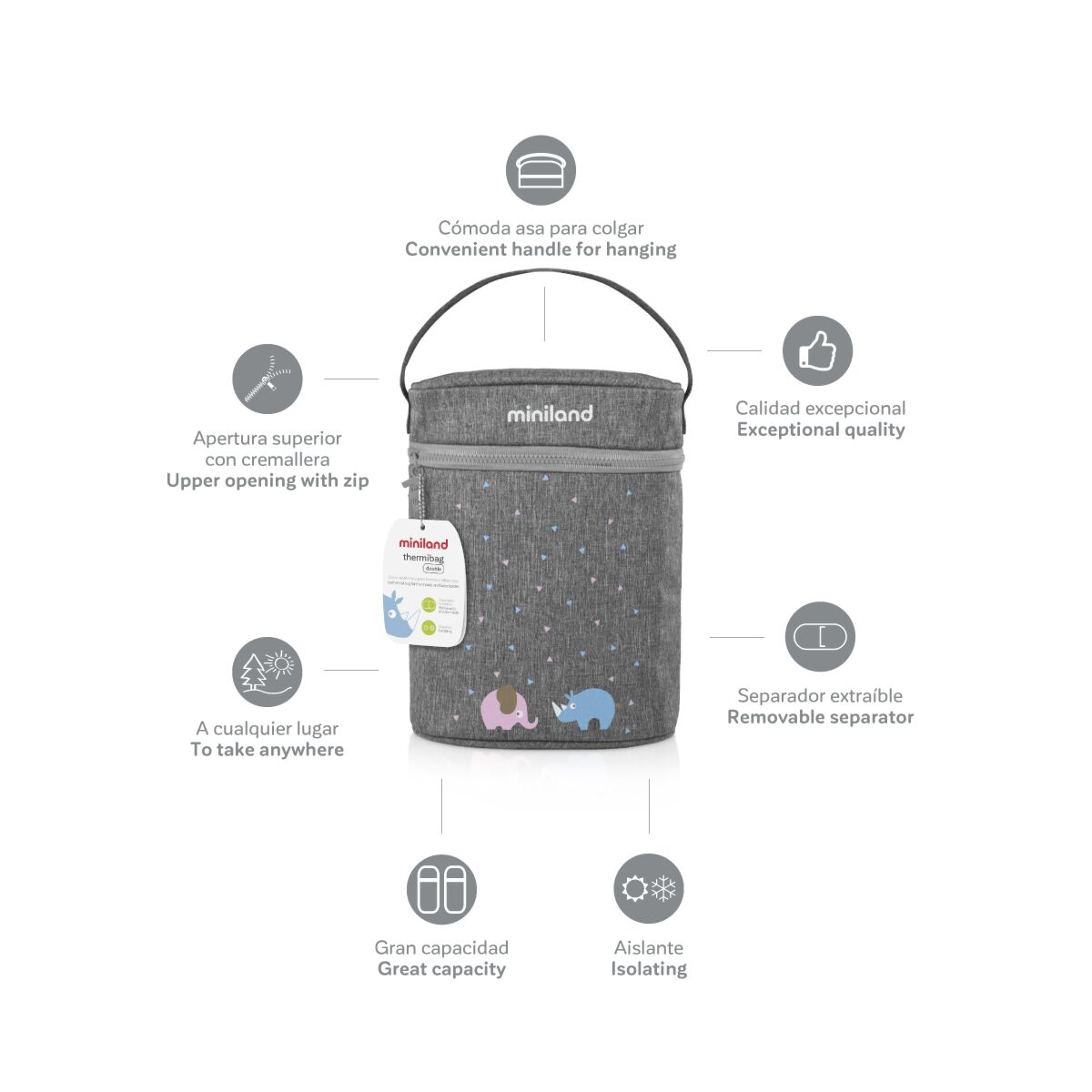 Il dispose d’une séparation intérieure pour éviter que les deux biberons ou thermos ne se touchent entre eux et pour augmenter l’isolation. De plus, pour le rendre vraiment pratique, le séparateur est extractible, créant ainsi un compartiment plus grand pour des petites bouteilles ou des récipients plus grands.