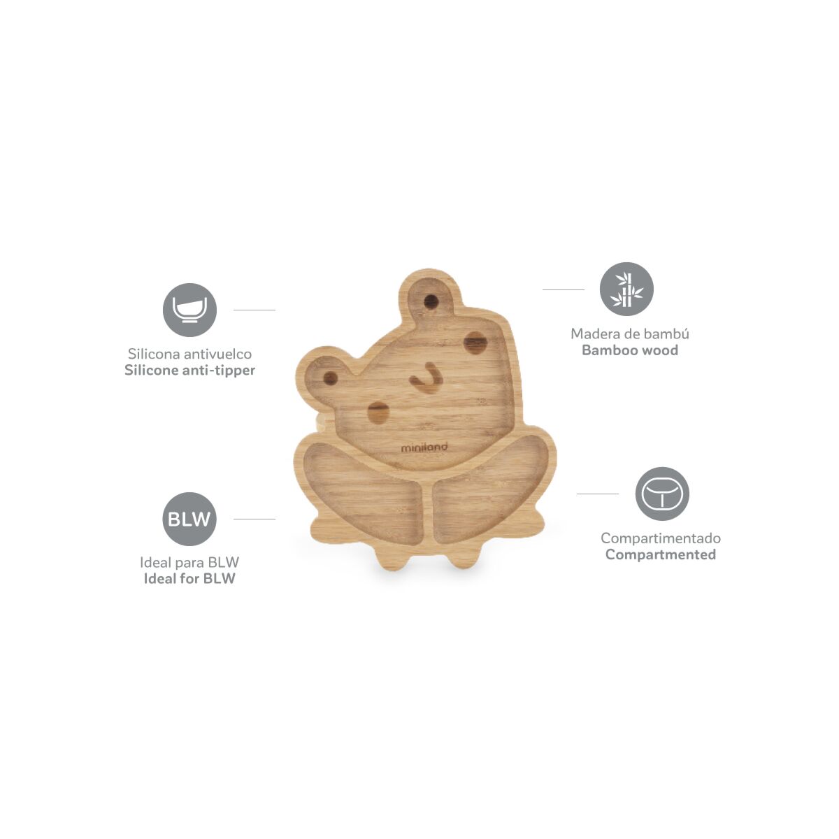 ASSIETTE COMPARTIMENTÉE EN BOIS ÉCO-RESPONSABLEPour savourer les meilleurs repasCe set comprend une assiette fabriquée àpartir de matériaux naturels et durables, idéale pour profiter des repas. L’assiette est compartimentée pour séparer différents types d’aliments et apprendre aux tout-petits les proportions nécessaires àune alimentation équilibrée.AntichuteSous l’assiette se trouve une ventouse en silicone qui lui permet de bien adhérer àla surface, évitant ainsi qu’elle ne soit renversée par l’enfant.Un design inspiréde la natureFabriquée en bois naturel et durable, cette assiette aide les enfants àapprendre àmanger de façon ludique tout en développant leur respect pour l’environnement.100 % naturel et durableL’assiette est fabriquée à100 % en bois de bambou certifiéFSC, et la ventouse est en silicone de qualitéalimentaire.