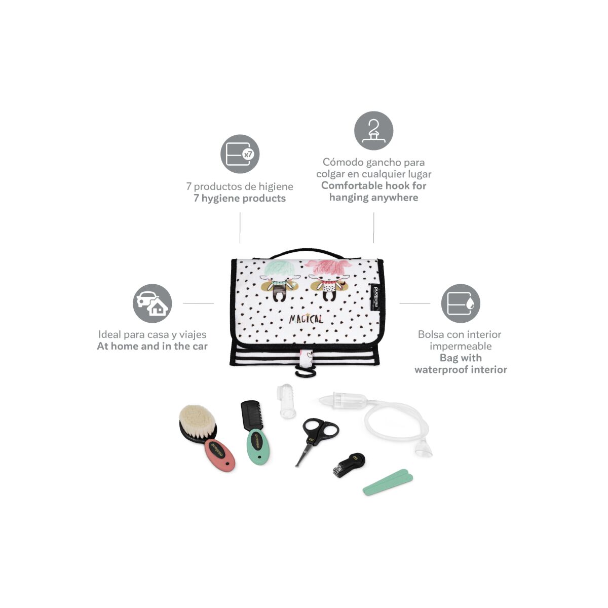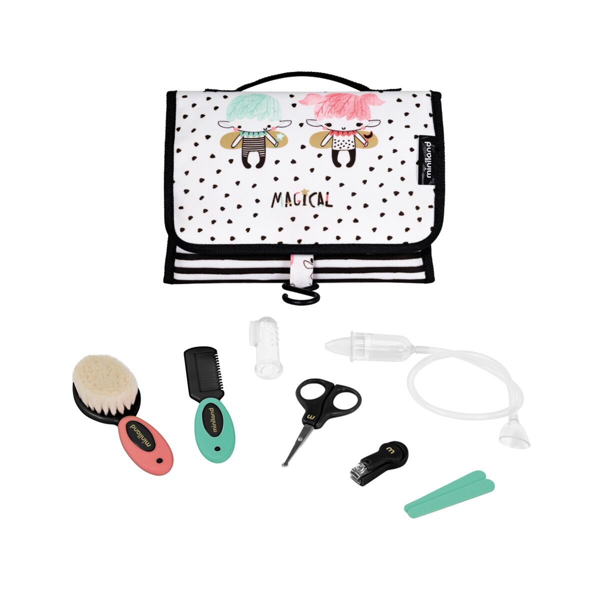 La divertente borsa da toilette del carekit magical include tutto l’essenziale per la cura e l’igiene quotidiana dei più piccoli: un pettine e una spazzola con setole naturali, forbici, tagliaunghie e due lime per prendersi cura delle loro unghiette, un aspiratore nasale e uno spazzolino in silicone per pulire i loro dentini e massaggiare le gengive.