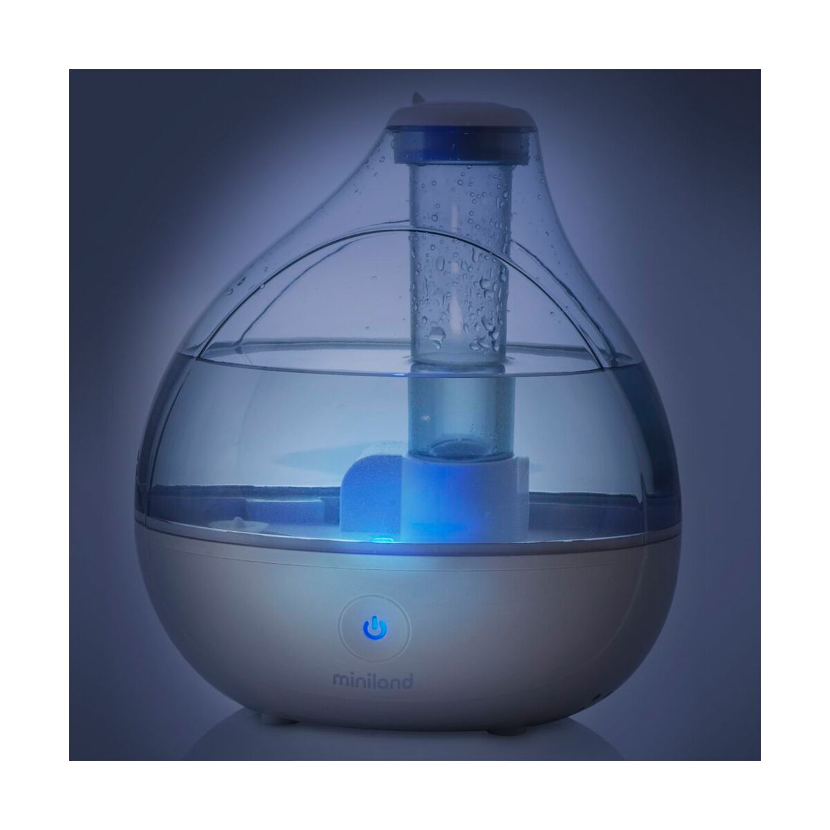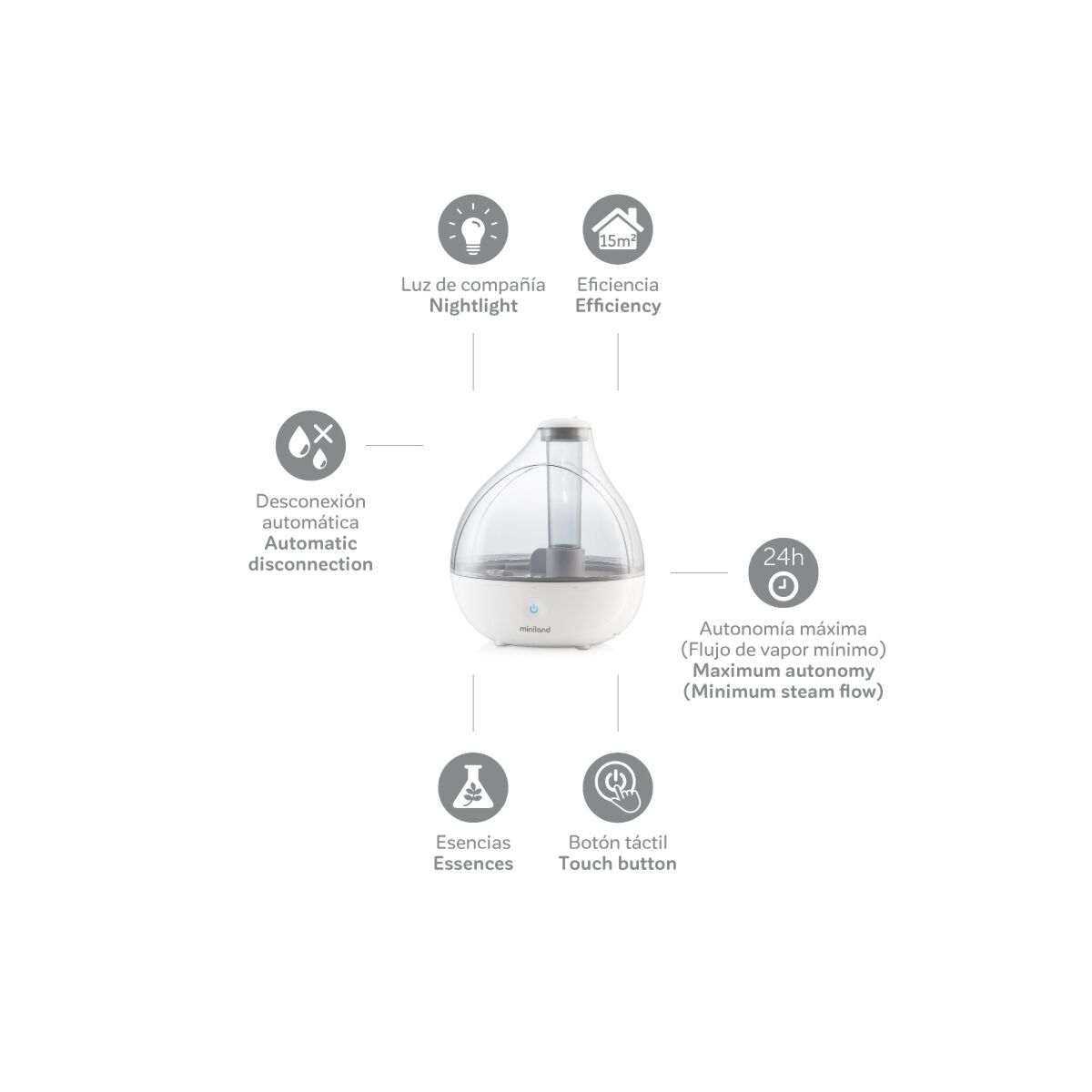 Eleganza e funzionalitàcon minimo ingombrohumidrop èl'umidificatore di minori dimensioni di Miniland ed èdotato di un design molto elegante. Grazie al suo diametro ridotto, risulta facile da collocare su qualsiasi superficie.Le essenze preferiteLo scomparto per essenze di questo umidificatore permette di utilizzare tutti i tipi di essenze del mercato.Umidificatore a vapore freddo, di grande autonomiaCon grande autonomia di funzionamento, superiore a 12 ore con flusso di vapore massimo, anche con le sue ridotte dimensioni. Capacitàdel serbatoio di 1,5 litri. Ideale per stanze fino a 15m2.Funzionamento molto semplice alla portata di tuttiPermette di controllare in un modo semplice, mediante un pulsante tattile, il flusso di vapore che si desidera ottenere in ciascun momento.Umidificazione omogeneaIl suo ugello orientabile permette di umidificare tutto lo spazio in un modo omogeneo, ripartendo il vapore freddo equamente in tutta la stanza.Dolce luce da compagnia opzionaleOffre la possibilitàdi attivare o disattivare una dolce luce azzurra che faràcompagnia al bebèmentre l'apparecchio èin funzione.Avviso di serbatoio di acqua vuoto e spegnimento automaticoDispone di un sistema di protezione per mancanza di acqua, che lo spegne automaticamente. Un indicatore luminoso si accende per avvisare che occorre riempire il serbatoio.