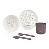 Dalla campagna alla tavola. Un set pappa completo con fantasia a rane o pulcini per i piùpiccoli formato da 5 pezzi (piatto, ciotola, bicchiere, forchetta e cucchiaio) e fabbricati con materiali 100% di origine naturale e biologici. Grazie alle dimensioni ridotte, i bambini possono imparare a mangiare da soli e conoscere gli alimenti.