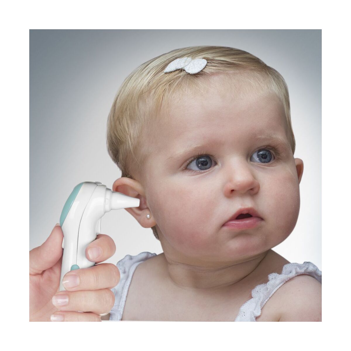 Misura la temperatura mediante infrarossi, in soli 2 secondi, a contatto con la fronte o l'orecchio del bebè.