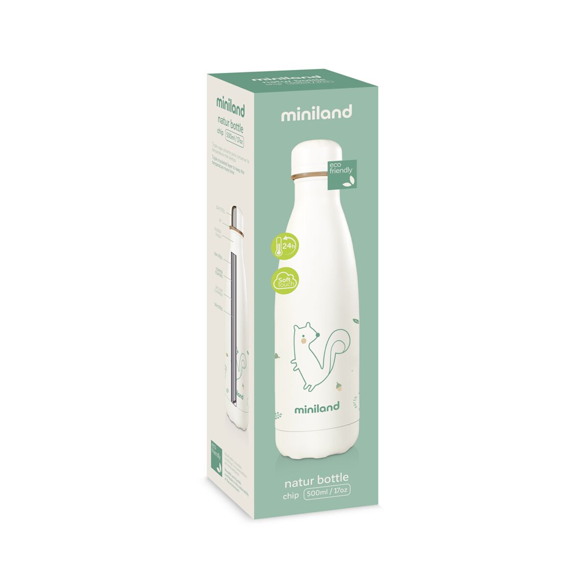 Toujours adaptées au bébé! Les bouteilles thermiques de 500 ml chip et bunny sont le complément idéal des thermos natur, de sorte que parents et enfants puissent partager le même style.Maintient la température des liquides plus de 24 heures Les bouteilles thermiques de Miniland sont très résistantes et effi caces grâce àleur double paroi en acier 18/8 (acier 304) et àleur chambre àvide, de sorte qu’elles gardent le froid et la chaleur pendant une journée entière.Design avec des motifs naturelsLa gamme natur thermos possède des designs inspirés de la nature, avec deux modèles pour satisfaire les goûts de tous les parents, ainsi qu’un doux toucher gommeux. De plus, sa base en silicone aide le thermos àadhérer aux surfaces et àéviter sa chute.Réutilisable et durable Sa fabrication en acier inoxydable permet de prolonger son utilisation dans le temps, contribuant ainsi àla protection de l’environnement. Ainsi les parents pourront apprendre aux plus petits l’importance de prendre soin et de respecter le monde dans lequel ils vont vivre.Matériaux de très grande qualitéAvec de l’acier 18/8 (acier 304) àl’intérieur, qui offre une très basse conductivité thermique et une très bonne résistance aux températures élevées, c’est le matériau le mieux adaptépour la conservation des aliments.