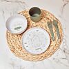 De la ferme àvotre table. Un service de vaisselle complet aux motifs de grenouilles ou de poussins pour les tout-petits, composéde 5 pièces (assiette, bol, verre, fourchette et cuillère) et réaliséen matériaux 100 % naturels et biosourcés. Grâce àleur petite taille, ils pourront savourer la nourriture par eux-mêmes et se familiariser avec les aliments.