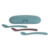 Set de couverts anatomiques évolutifs avec étui de protection. Contient deux cuillères (une souple et une plus dure) et une fourchette à bouts arrondis, toutes adaptées au contact avec les gencives de votre bébé. D'une belle couleur océan et allant au lave-vaisselle.