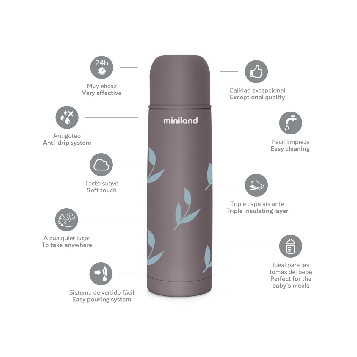 Les thermos de Miniland présentent une haute résistance et une grande efficacité grâce à leur double paroi en acier avec une couche exclusive en aluminium et leur chambre sous vide.