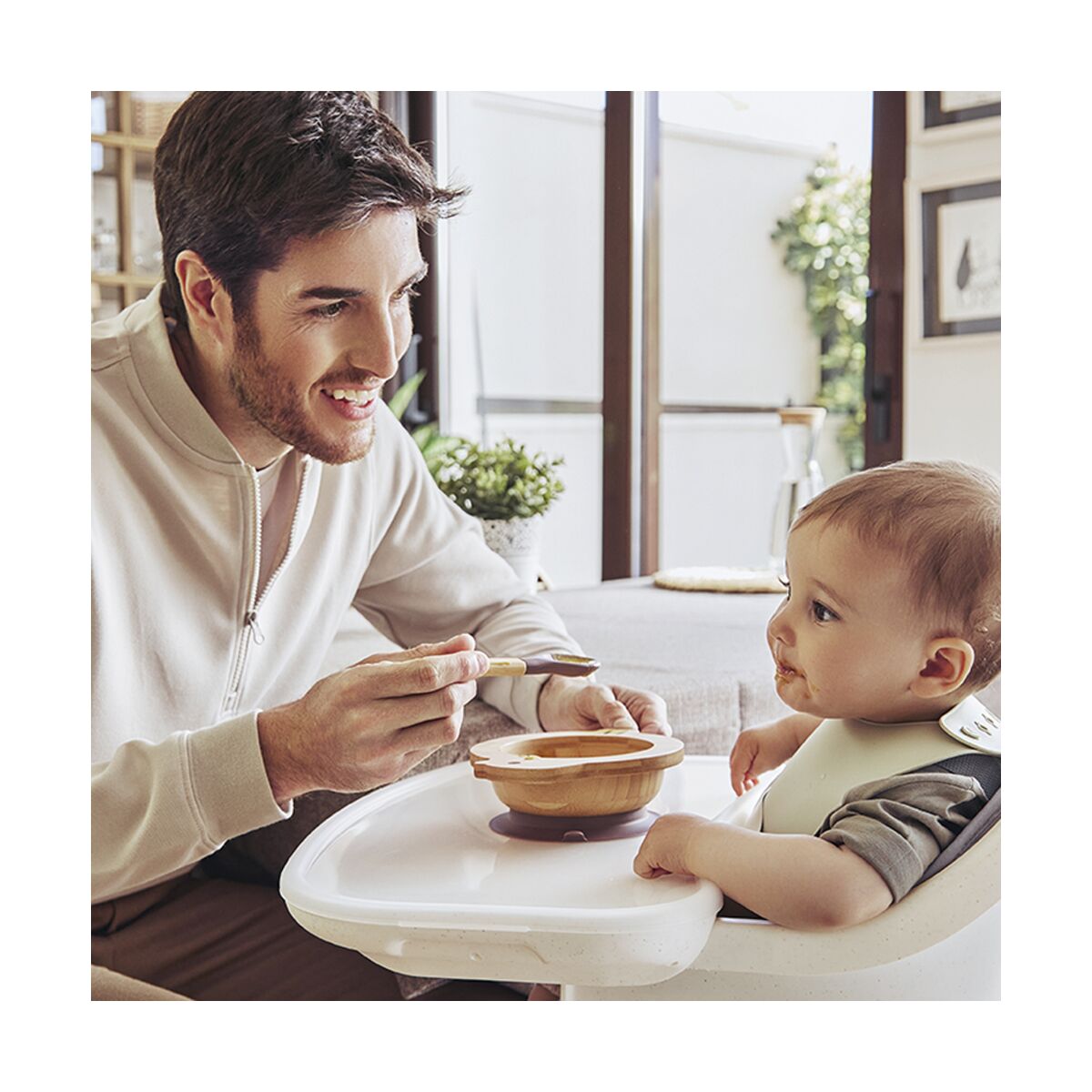 SET BOL ET CUILLÈRE EN BOIS ÉCO-RESPONSABLEPour savourer les meilleurs repasCe set comprend un bol et une cuillère fabriqués àpartir de matériaux naturels et durables, pour permettre aux tout-petits de profiter de leurs repas. La cuillère est dotée d’un embout en silicone, particulièrement doux pour les gencives sensibles des jeunes enfants.AntichuteSous le bol se trouve une ventouse en silicone qui permet de le fixer facilement àla surface de la chaise haute ou de la table. Ainsi, votre enfant ne pourra pas le renverser au sol.Un design inspirépar la natureFabriquéen bois naturel et durable, ce set aide les enfants àapprendre àmanger de façon ludique tout en respectant l’environnement.100 % naturel et durableLe bol et la cuillère sont réalisés à100 % en bois certifiéFSC, tandis que la ventouse et l’embout de la cuillère sont en silicone de qualitéalimentaire.