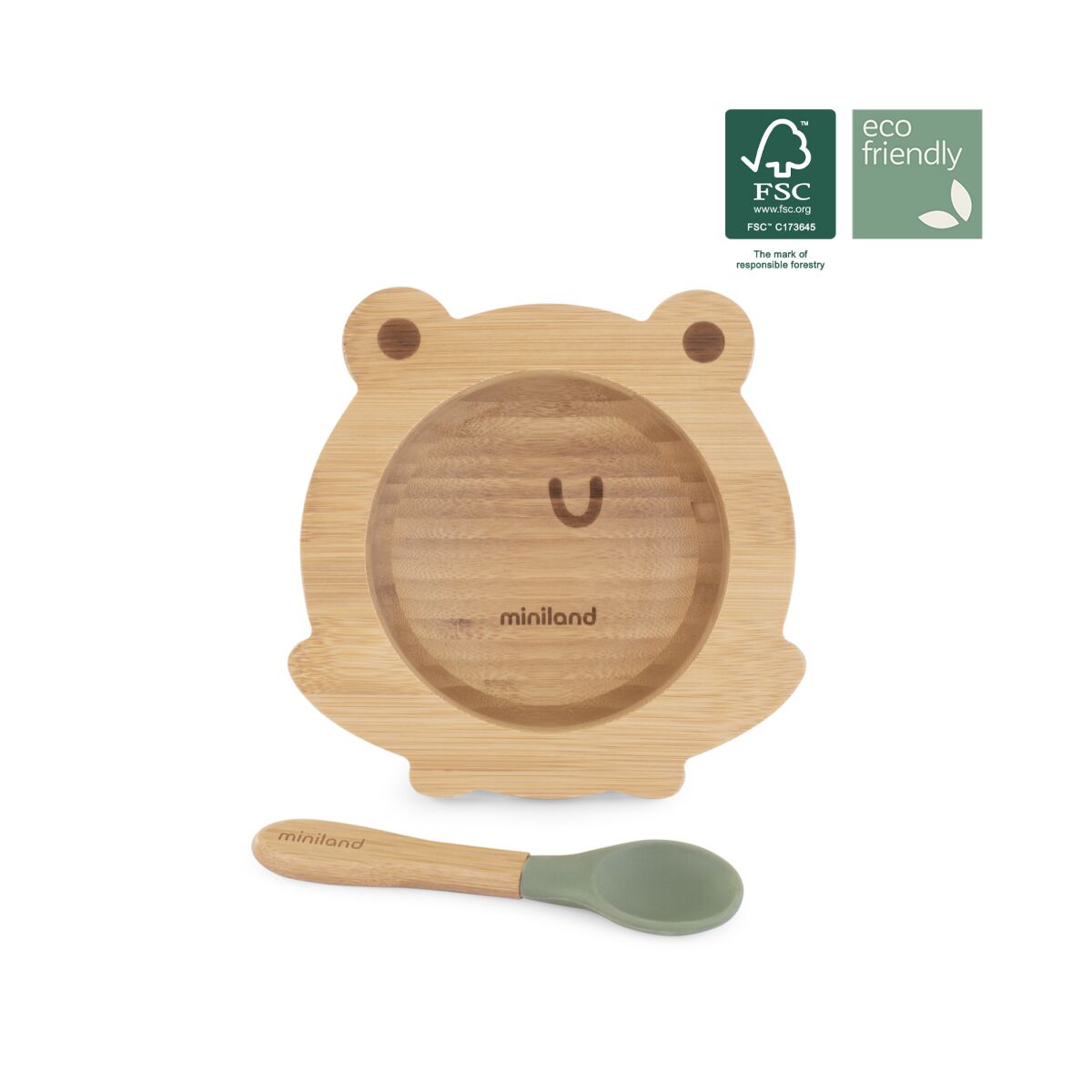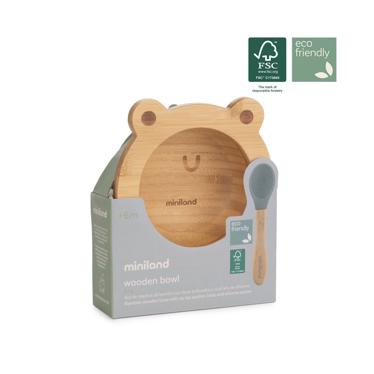 SET BOL ET CUILLÈRE EN BOIS ÉCO-RESPONSABLEPour savourer les repas en toute sérénitéCe set comprend un bol et une cuillère fabriqués àpartir de matériaux naturels et durables, parfaits pour profiter des repas. La cuillère est dotée d’un embout en silicone, plus doux pour les gencives sensibles des tout-petits.AntidérapantSous le bol, une ventouse en silicone permet une bonne adhérence àla surface. Ainsi, l’enfant ne pourra pas le renverser facilement pendant le repas.Un design inspiréde la natureFabriquéen bois naturel et durable, ce set initie les enfants au plaisir de manger tout en les sensibilisant au respect de la nature. Disponible en deux adorables modèles : grenouille et poussin.100 % naturel et durableLe bol et la cuillère sont fabriqués à100 % en bois certifiéFSC, et la ventouse ainsi que l’embout de la cuillère sont en silicone de qualitéalimentaire.