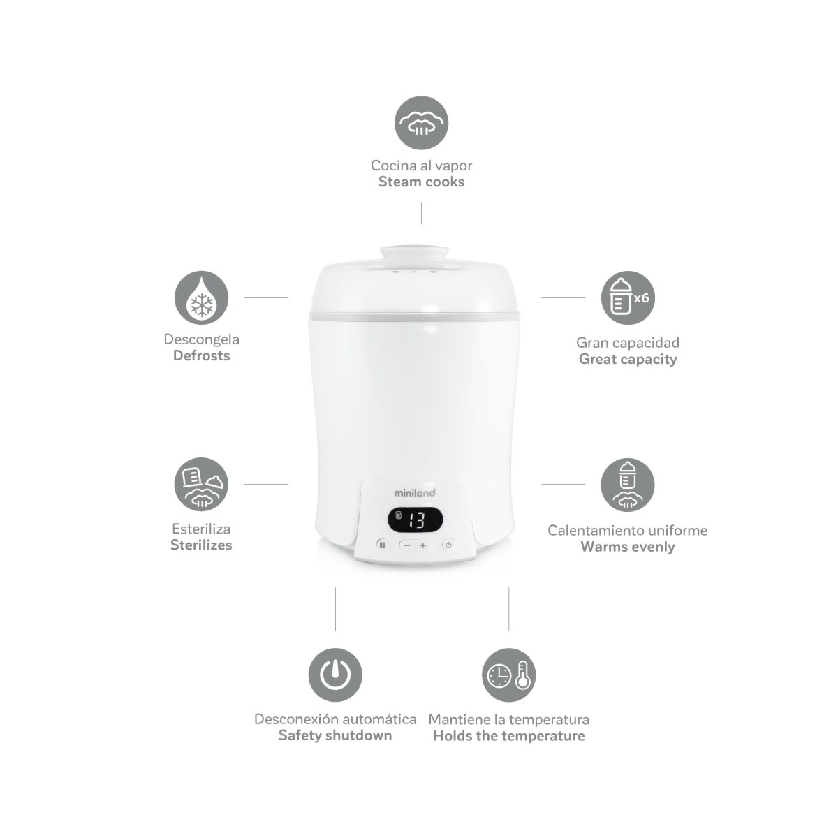 Scaldabiberon, sterilizzatore e vaporizzatore, 6 in 1. Dispositivo multifunzione per svolgere innumerevoli attività in modo agile e pratico: riscalda gradualmente biberon e omogenizzati, sterilizza e scongela al vapore fino a 6 biberon, cuoce uova e verdure al vapore preservandone le proprietà, mantiene la temperatura di biberon e omogenizzati...